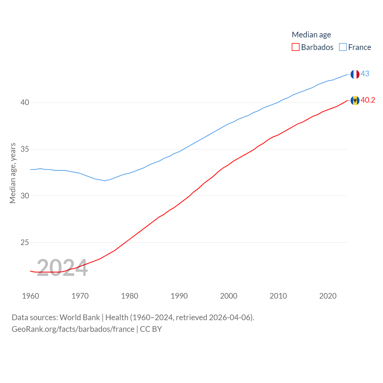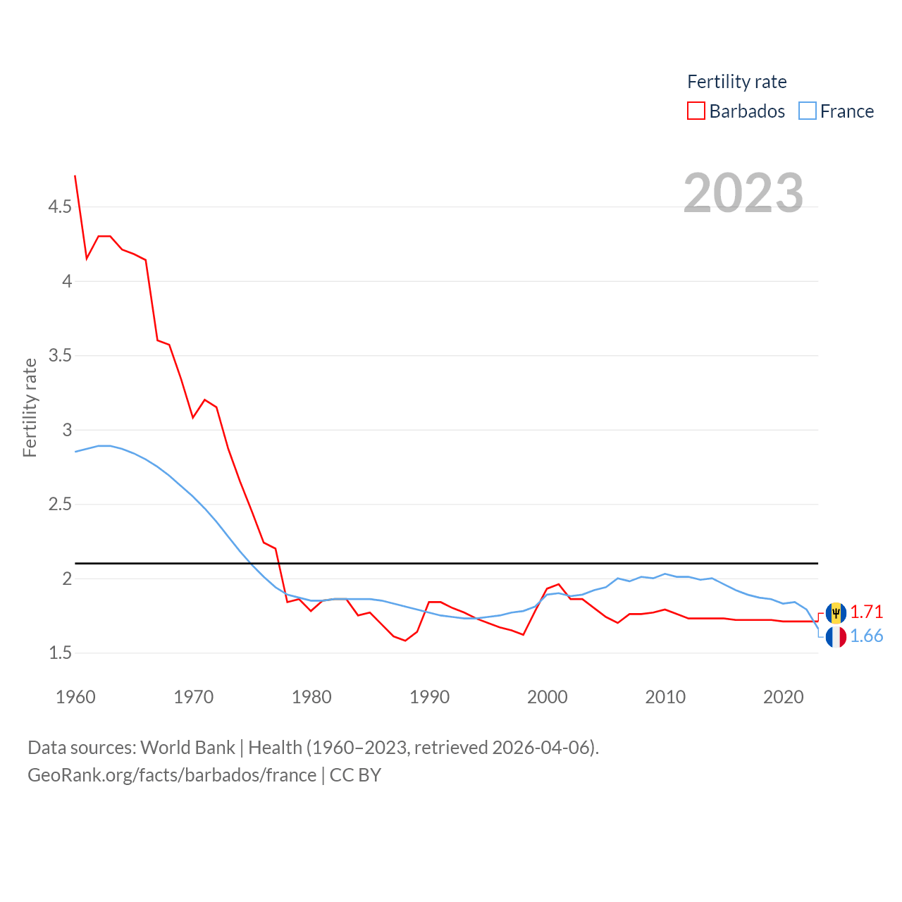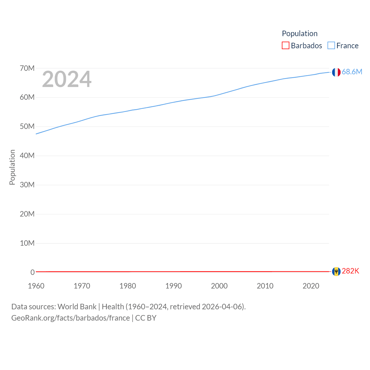 Barbados has a population of 282K (ranked 175/197), compared with 68.6M in France (ranked 23/197). Barbados' land area is 166 sq mi versus 208,090 sq mi for France (ranked 184th vs. 48th).