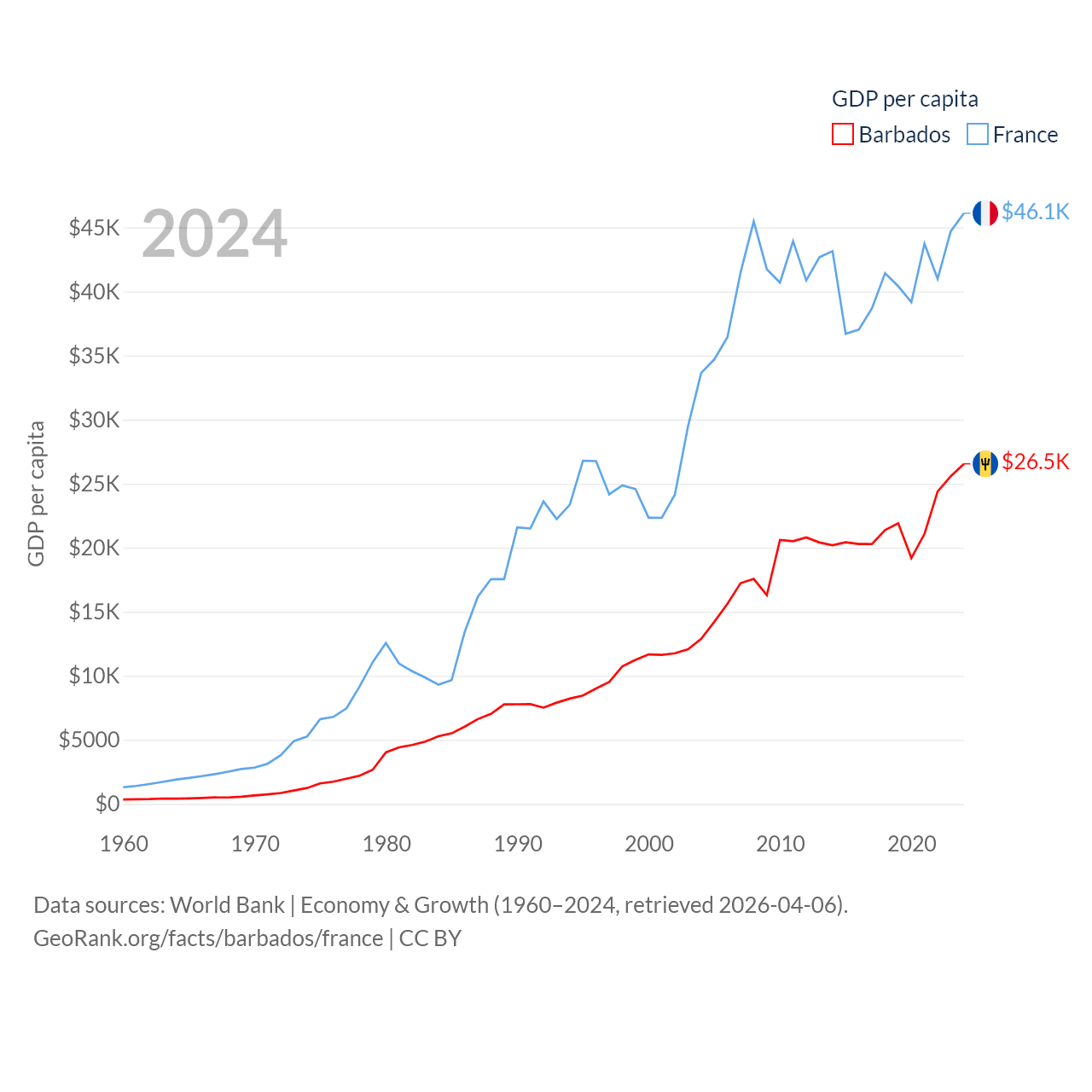 By GDP, Barbados ranks 157/197 ($7.5B) and France ranks 7/197 ($3.16T). By GDP per capita, Barbados ranks 46/197 ($26,545), while France ranks 27/197 ($46,103).