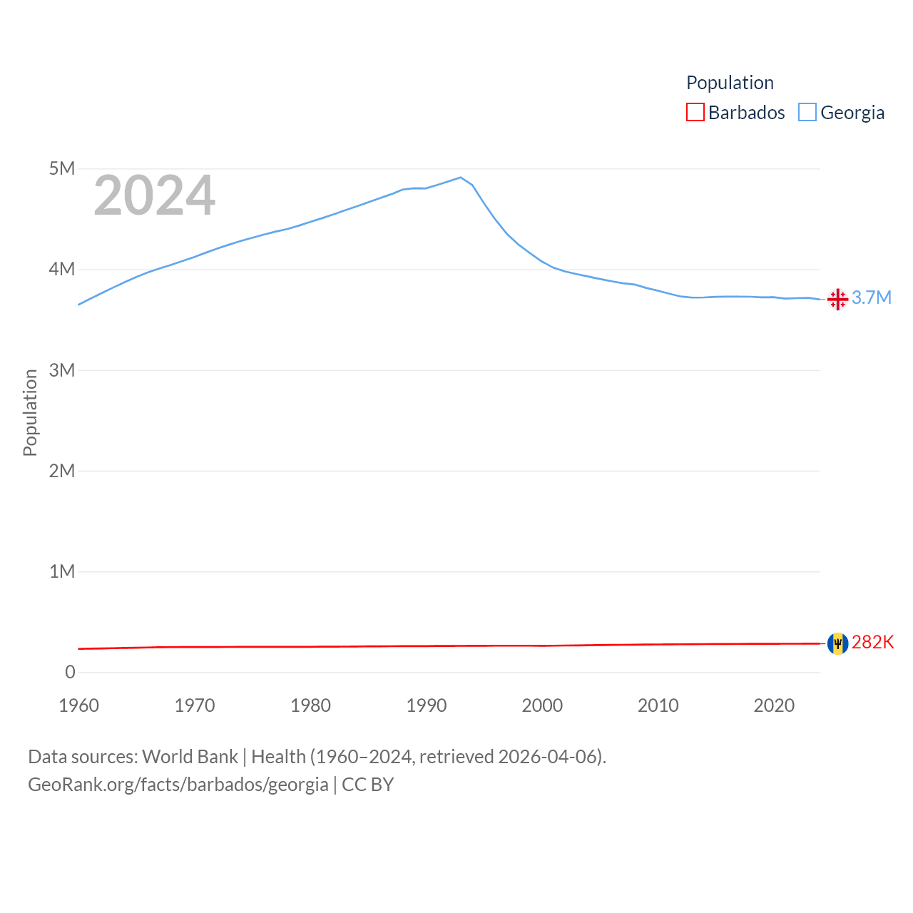 Barbados has a population of 282K (ranked 175/197), compared with 3.7M in Georgia (ranked 130/197). Barbados' land area is 166 sq mi versus 26,830 sq mi for Georgia (ranked 184th vs. 118th).