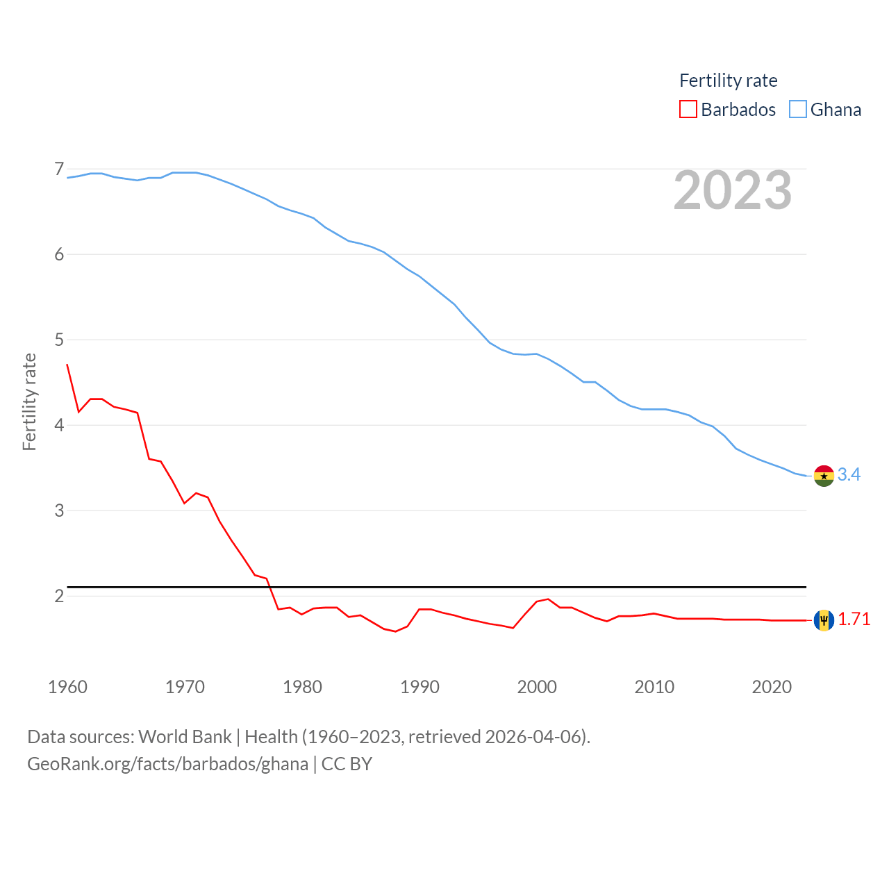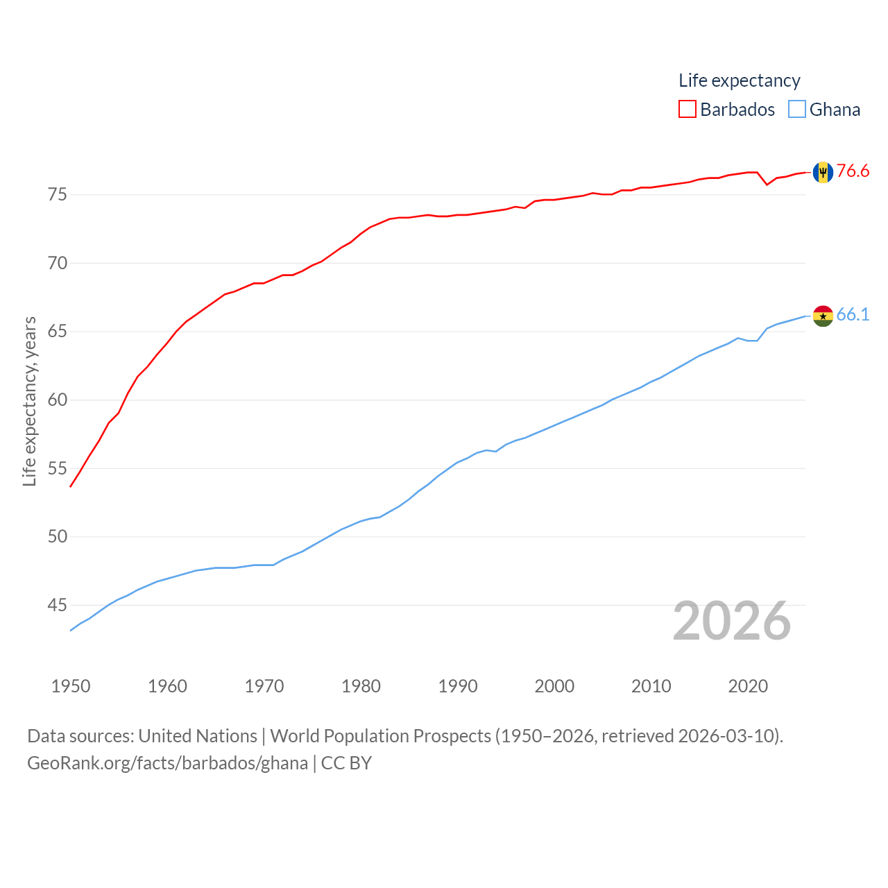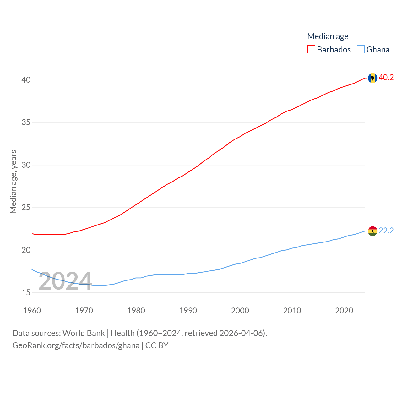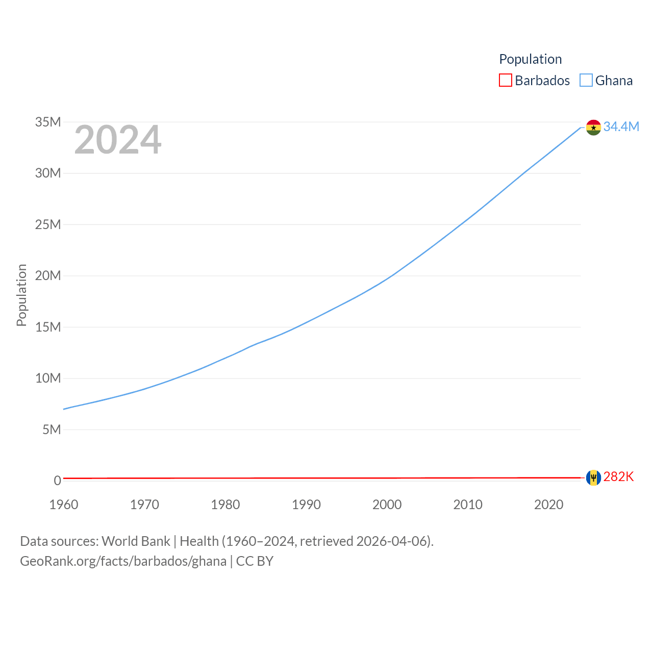 Barbados has a population of 282K (ranked 175/197), compared with 34.4M in Ghana (ranked 47/197). Barbados' land area is 166 sq mi versus 87,851 sq mi for Ghana (ranked 184th vs. 81st).