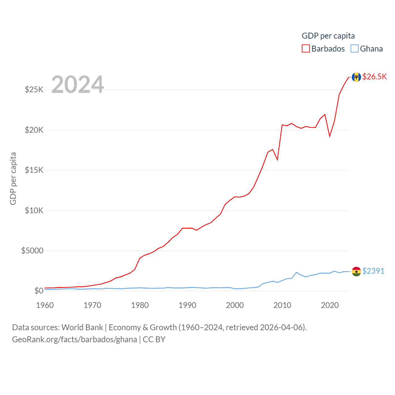 By GDP, Barbados ranks 157/197 ($7.5B) and Ghana ranks 80/197 ($82.3B). By GDP per capita, Barbados ranks 46/197 ($26,545), while Ghana ranks 151/197 ($2,391).