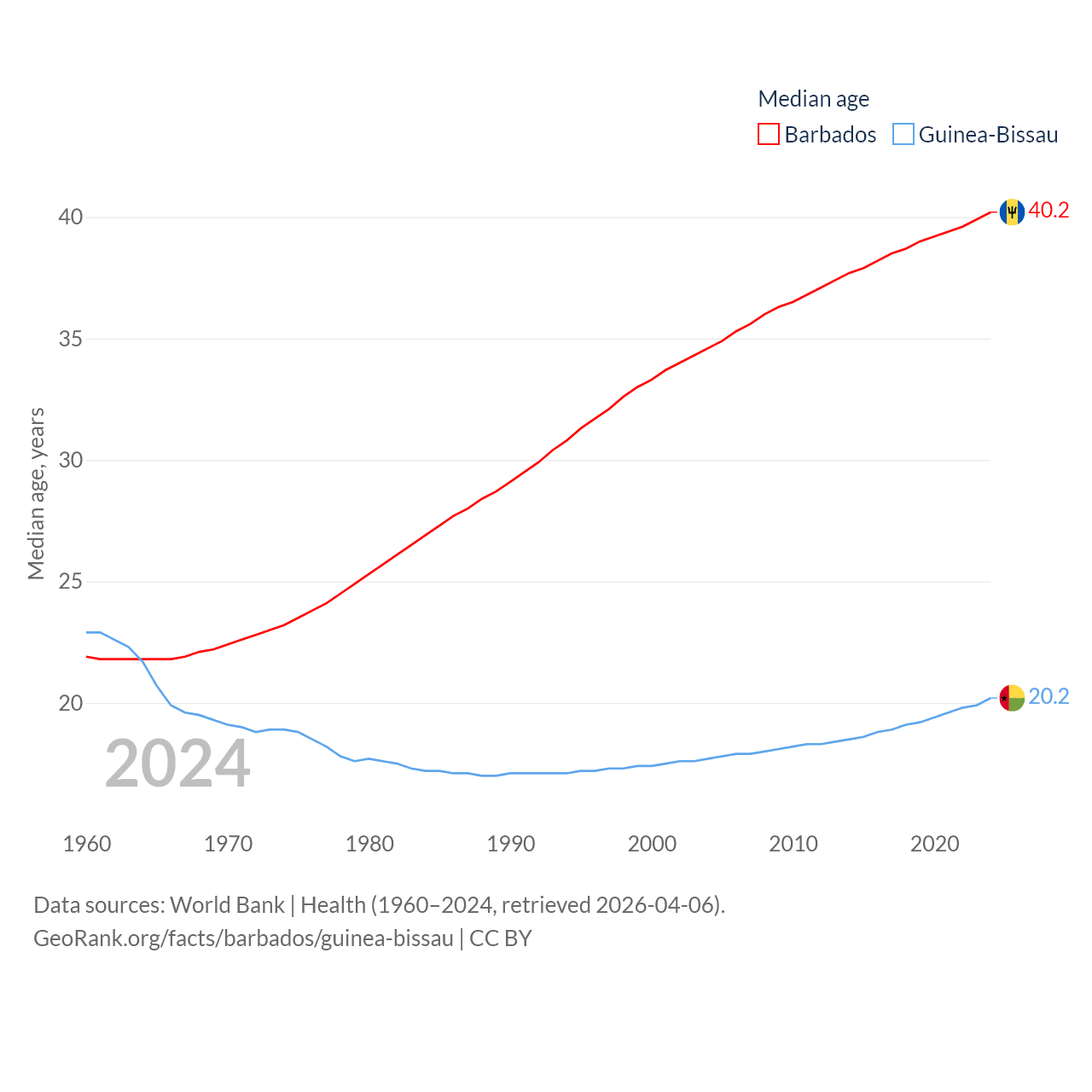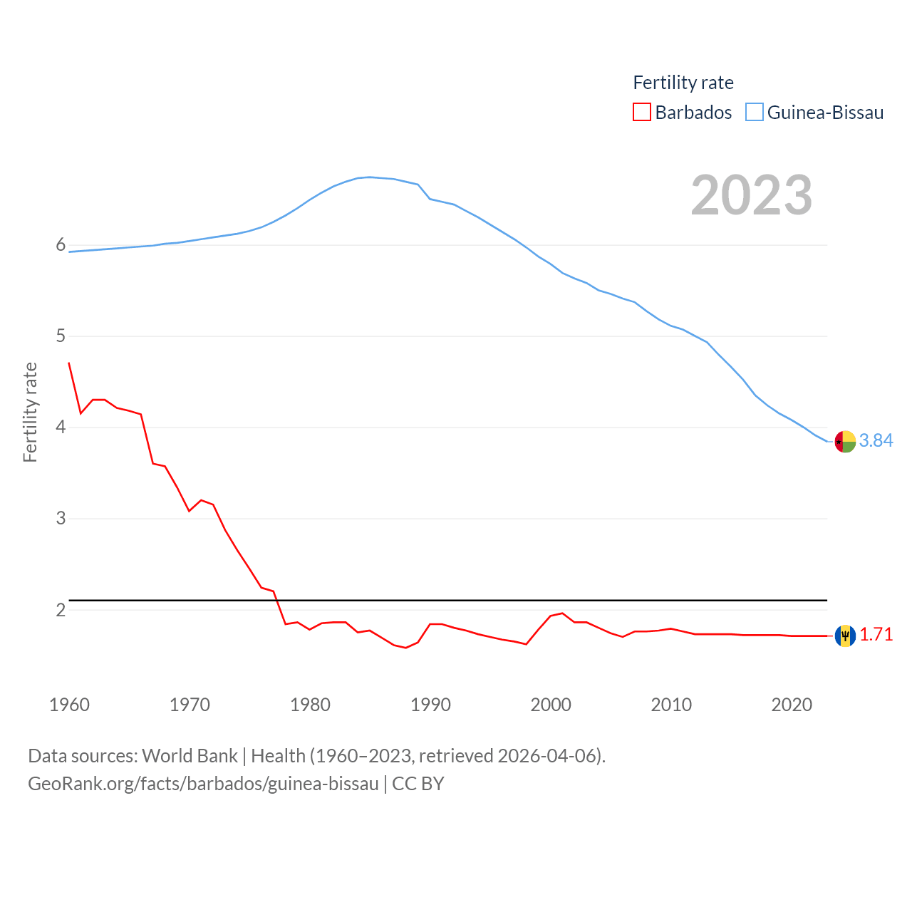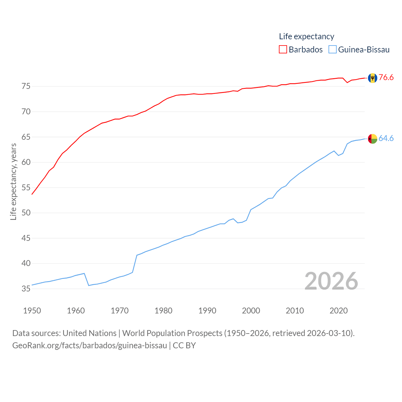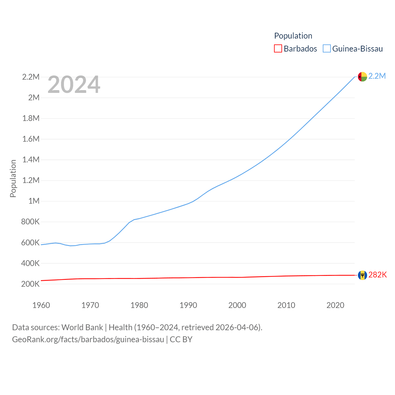 Barbados has a population of 282K (ranked 175/197), compared with 2.2M in Guinea-Bissau (ranked 146/197). Barbados' land area is 166 sq mi versus 10,857 sq mi for Guinea-Bissau (ranked 184th vs. 139th).