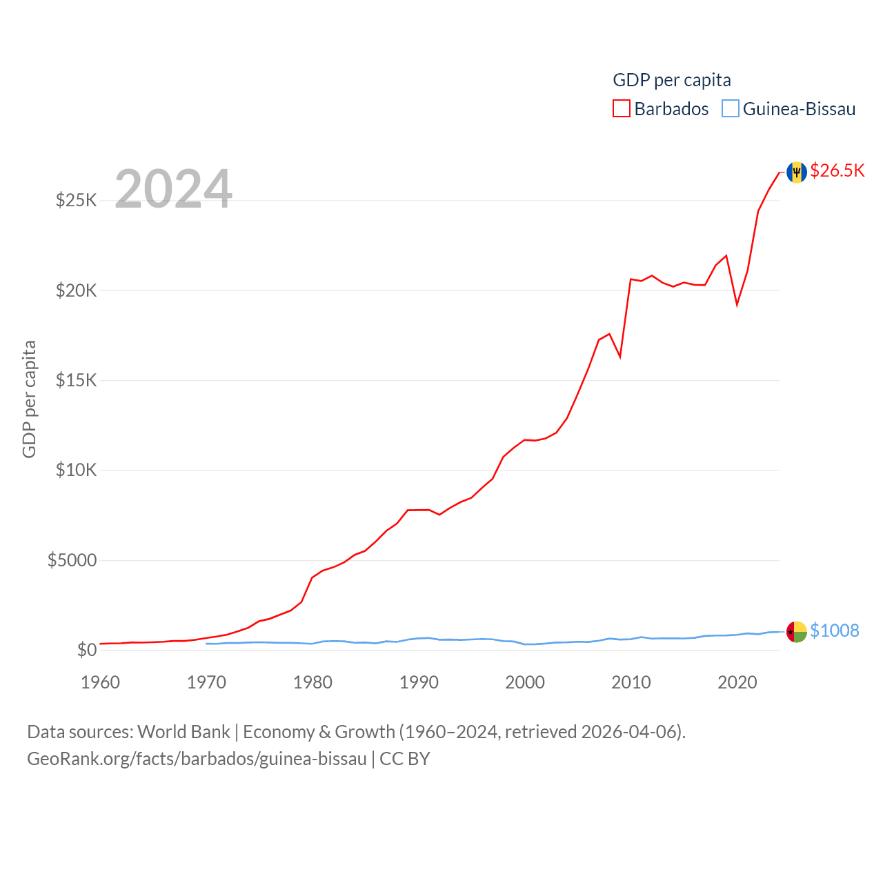 By GDP, Barbados ranks 157/197 ($7.5B) and Guinea-Bissau ranks 176/197 ($2.22B). By GDP per capita, Barbados ranks 46/197 ($26,545), while Guinea-Bissau ranks 177/197 ($1,008).