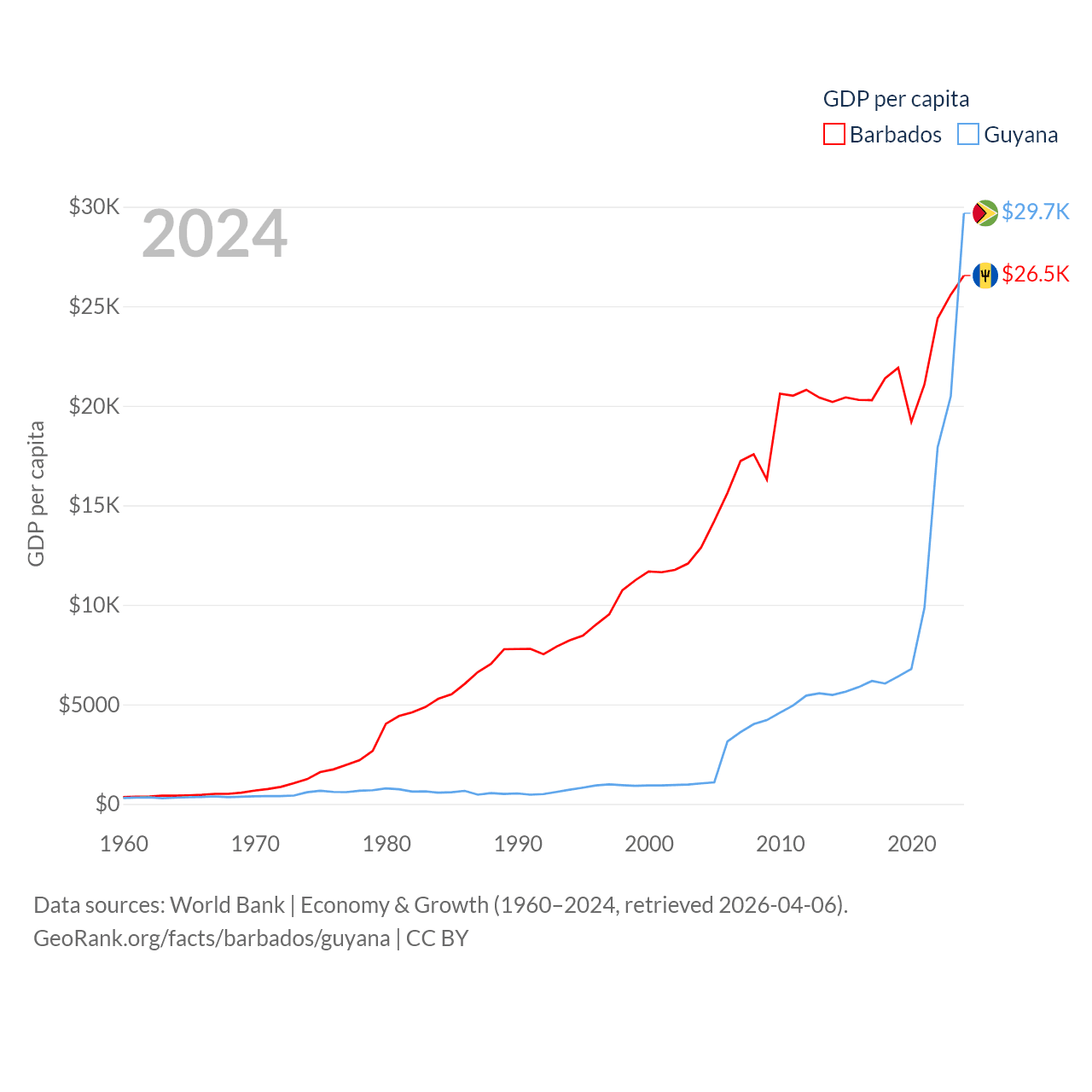 By GDP, Barbados ranks 157/197 ($7.5B) and Guyana ranks 120/197 ($24.7B). By GDP per capita, Barbados ranks 46/197 ($26,545), while Guyana ranks 41/197 ($29,675).