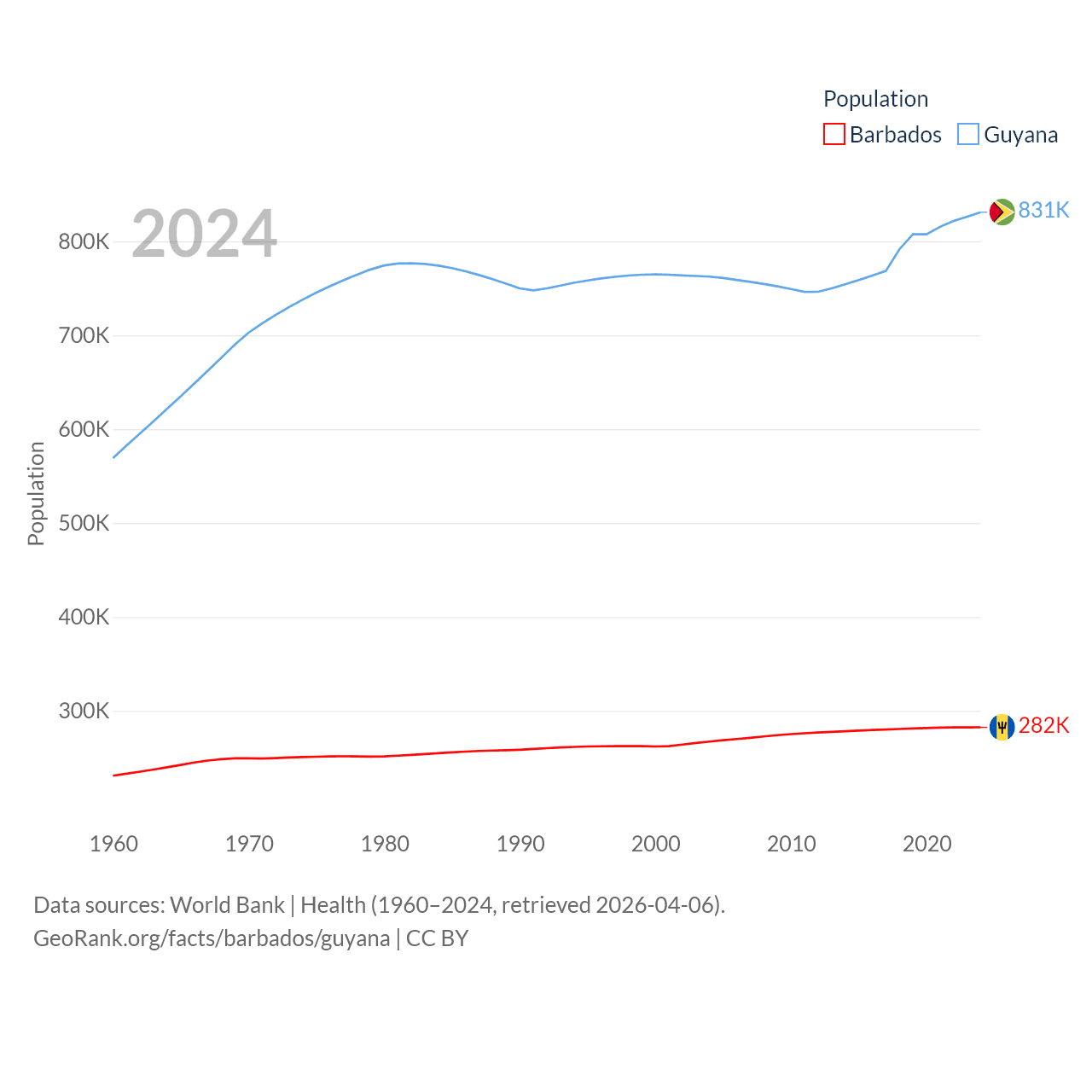 Barbados has a population of 282K (ranked 175/197), compared with 831K in Guyana (ranked 161/197). Barbados' land area is 166 sq mi versus 81,522 sq mi for Guyana (ranked 184th vs. 82nd).