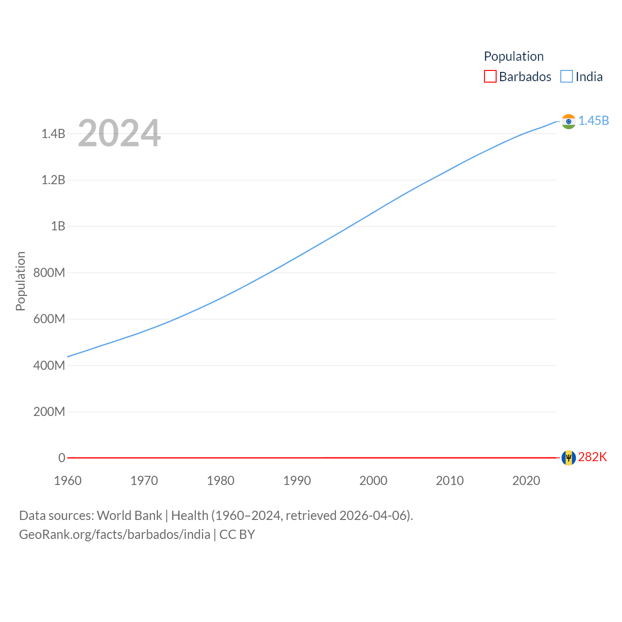 Barbados has a population of 282K (ranked 175/197), compared with 1.45B in India (ranked 1/197). Barbados' land area is 166 sq mi versus 1,147,955 sq mi for India (ranked 184th vs. 7th).