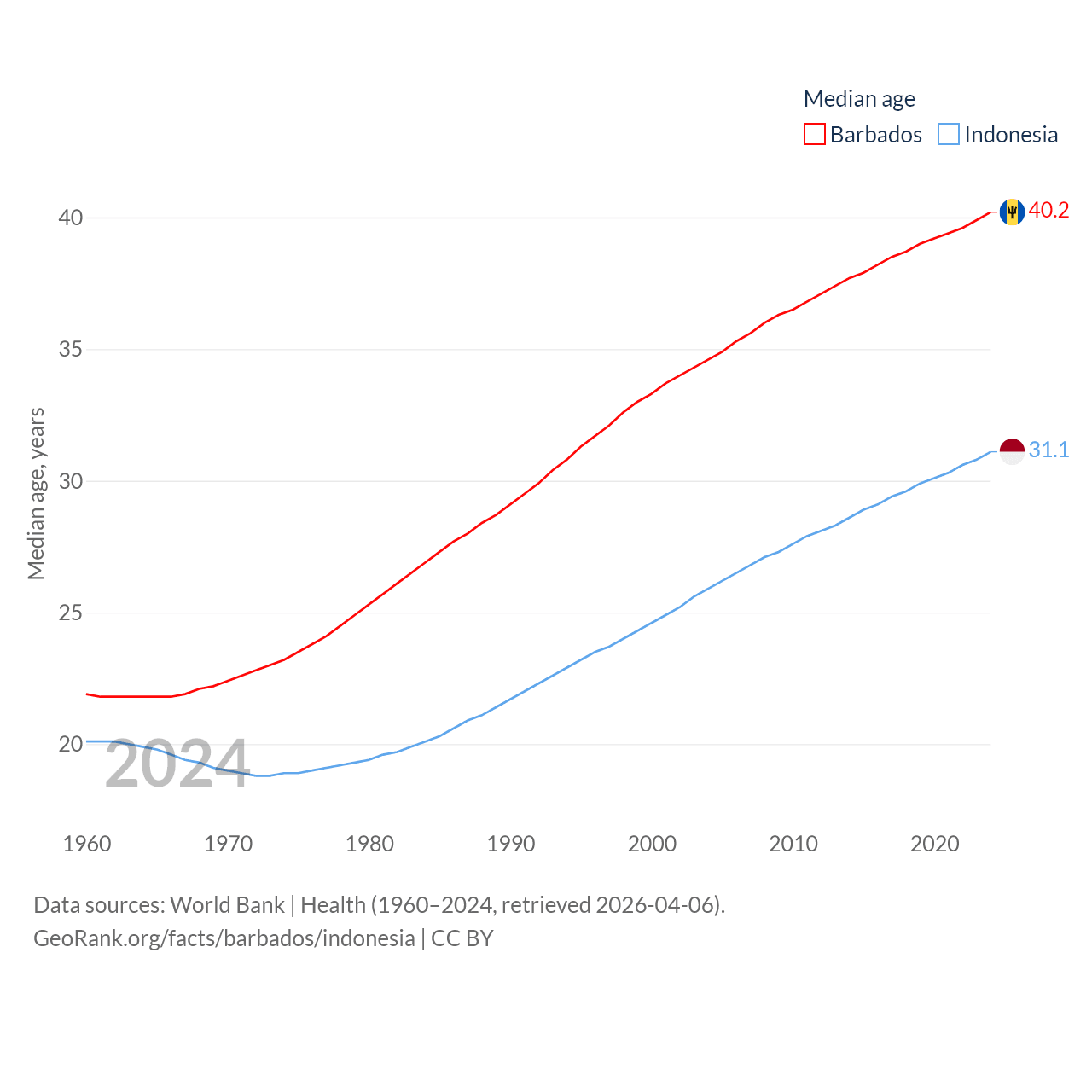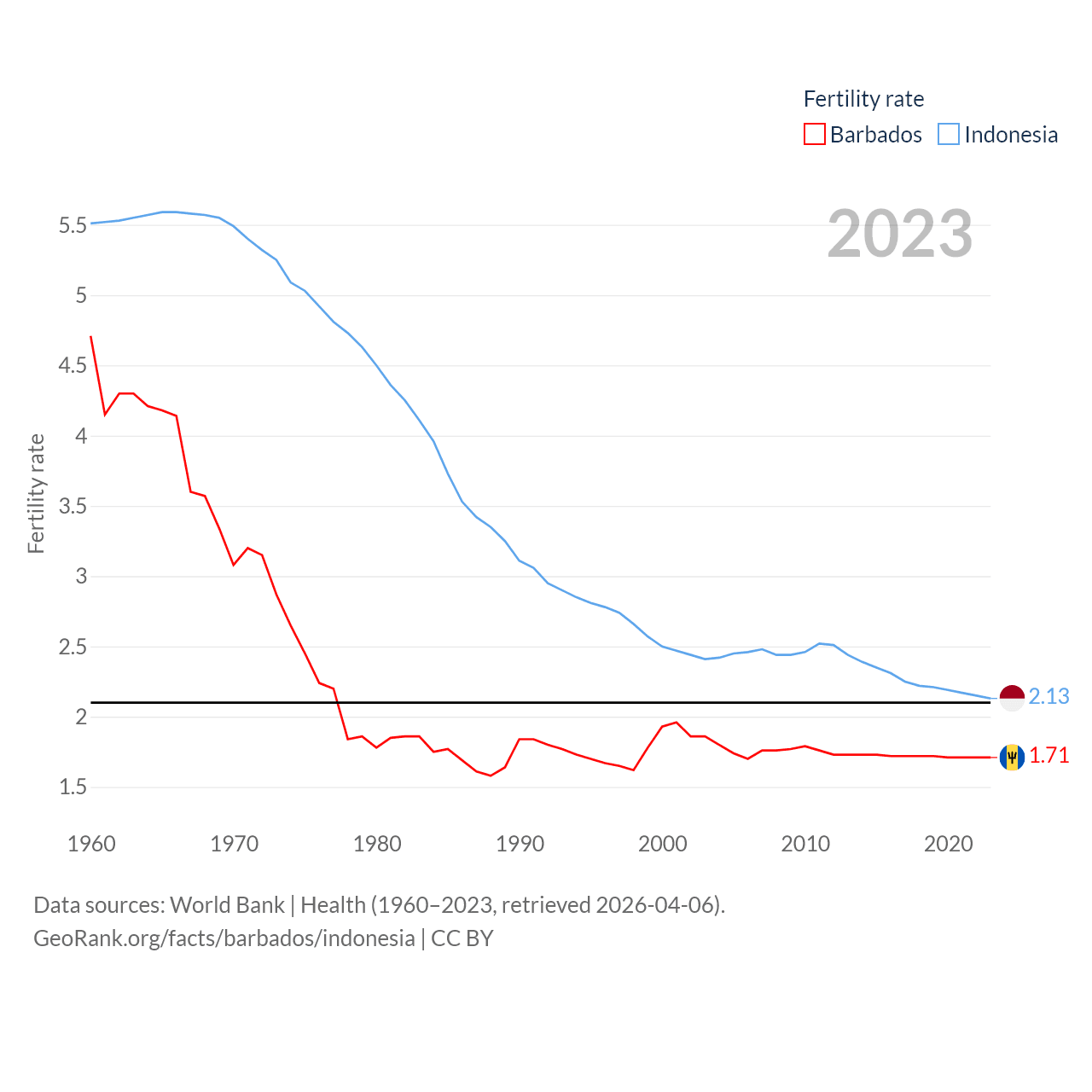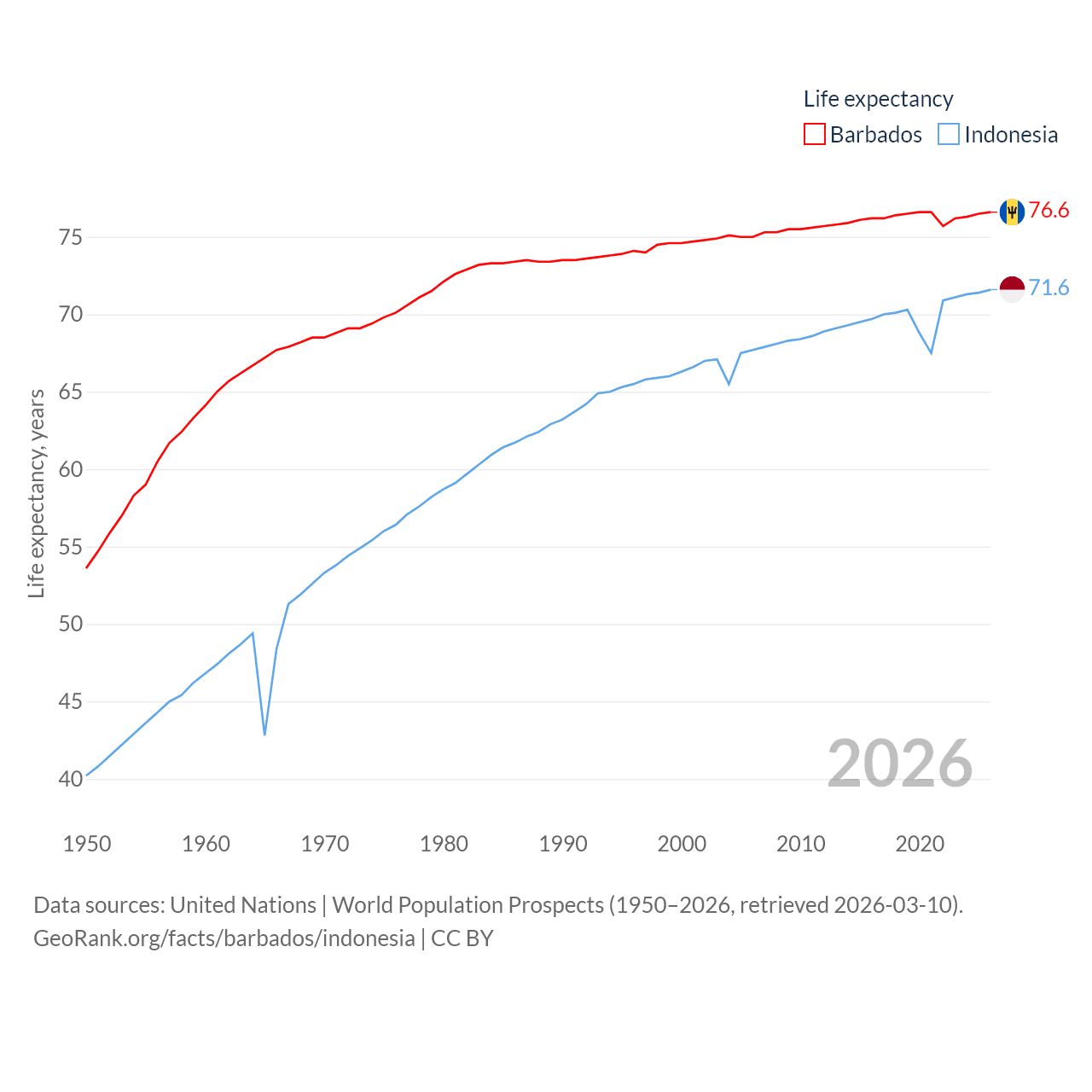 Barbados has a population of 282K (ranked 175/197), compared with 283M in Indonesia (ranked 4/197). Barbados' land area is 166 sq mi versus 730,720 sq mi for Indonesia (ranked 184th vs. 14th).