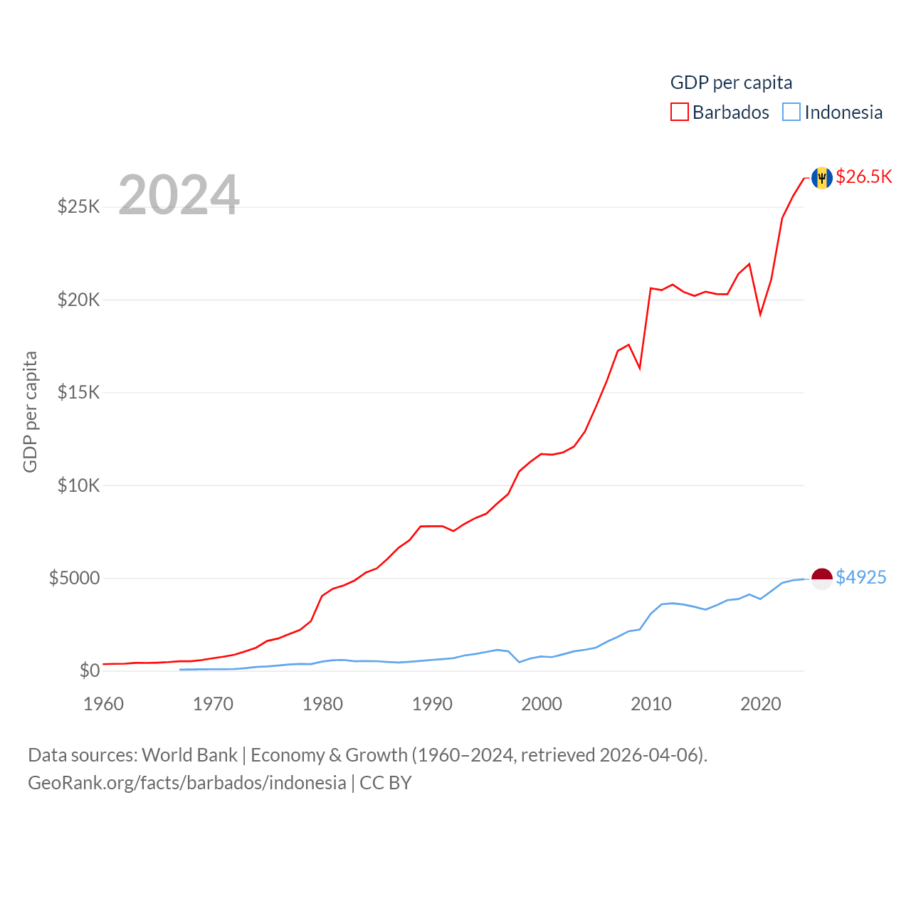 By GDP, Barbados ranks 157/197 ($7.5B) and Indonesia ranks 16/197 ($1.4T). By GDP per capita, Barbados ranks 46/197 ($26,545), while Indonesia ranks 121/197 ($4,925).