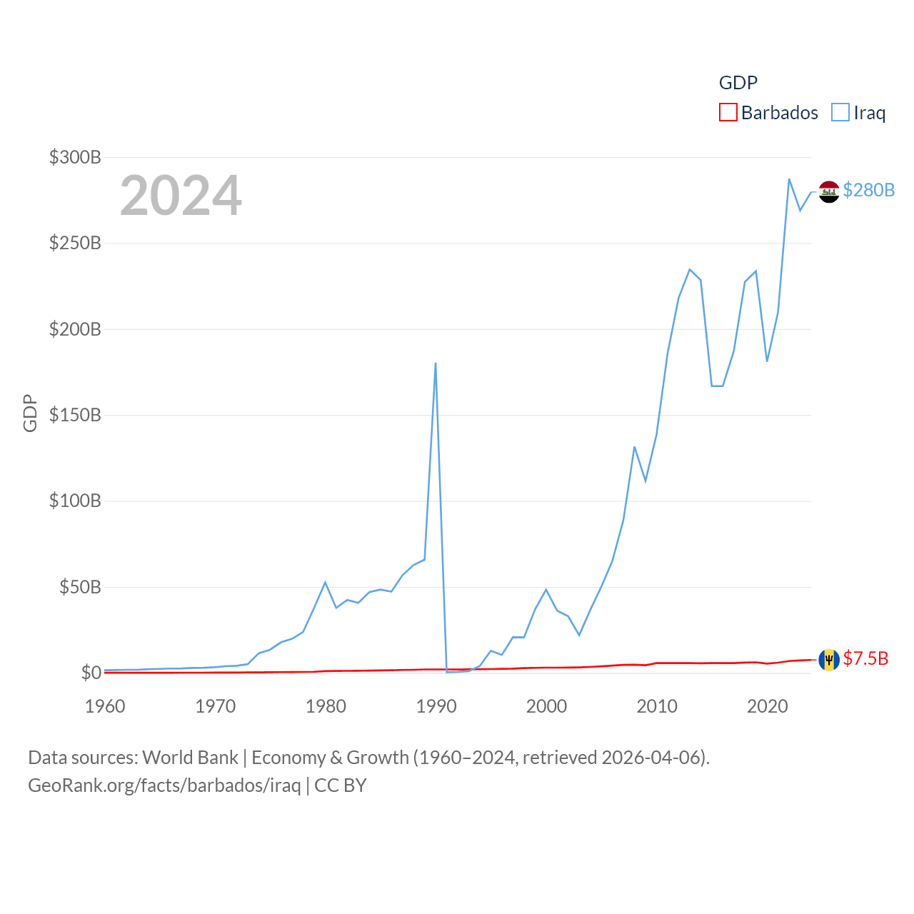 By GDP, Barbados ranks 157/197 ($7.5B) and Iraq ranks 50/197 ($280B). By GDP per capita, Barbados ranks 46/197 ($26,545), while Iraq ranks 113/197 ($6,074).