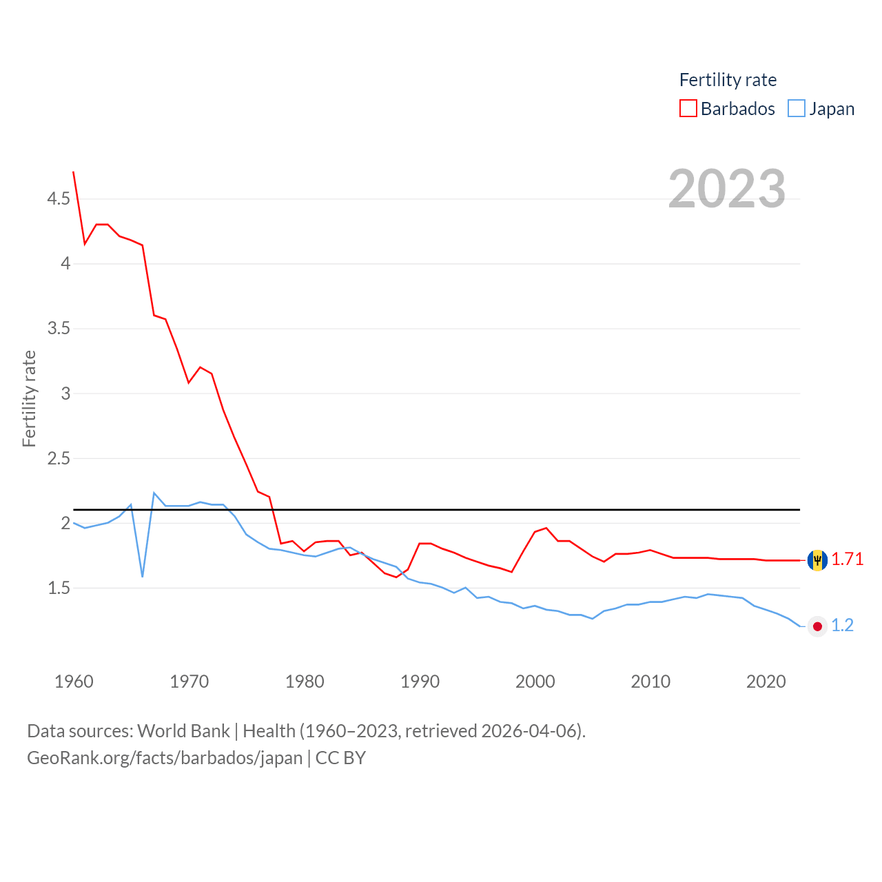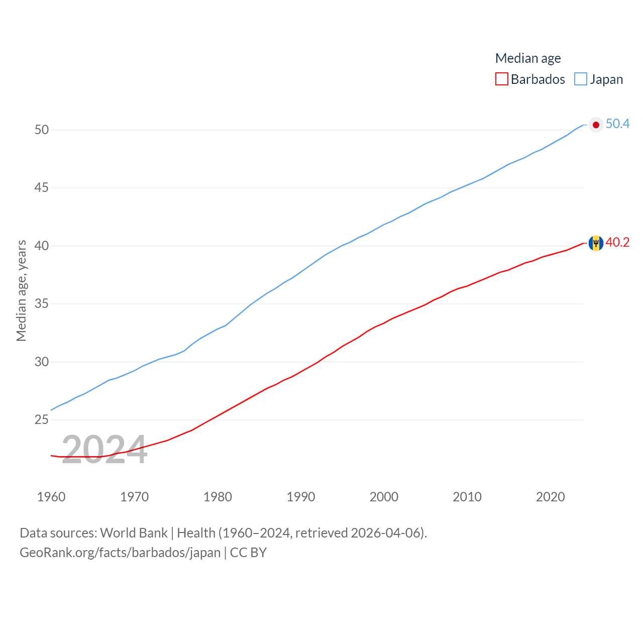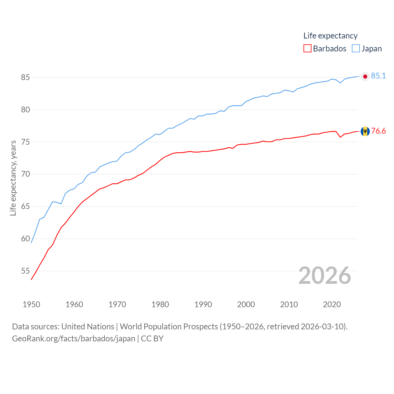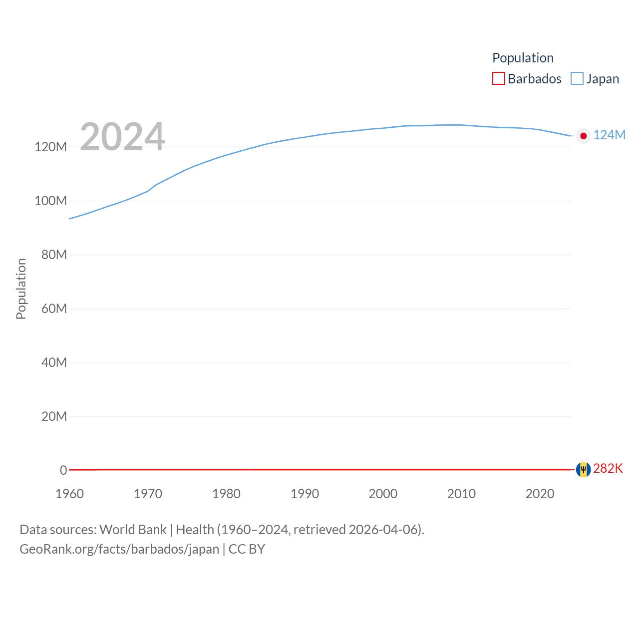 Barbados has a population of 282K (ranked 175/197), compared with 124M in Japan (ranked 12/197). Barbados' land area is 166 sq mi versus 140,761 sq mi for Japan (ranked 184th vs. 61st).