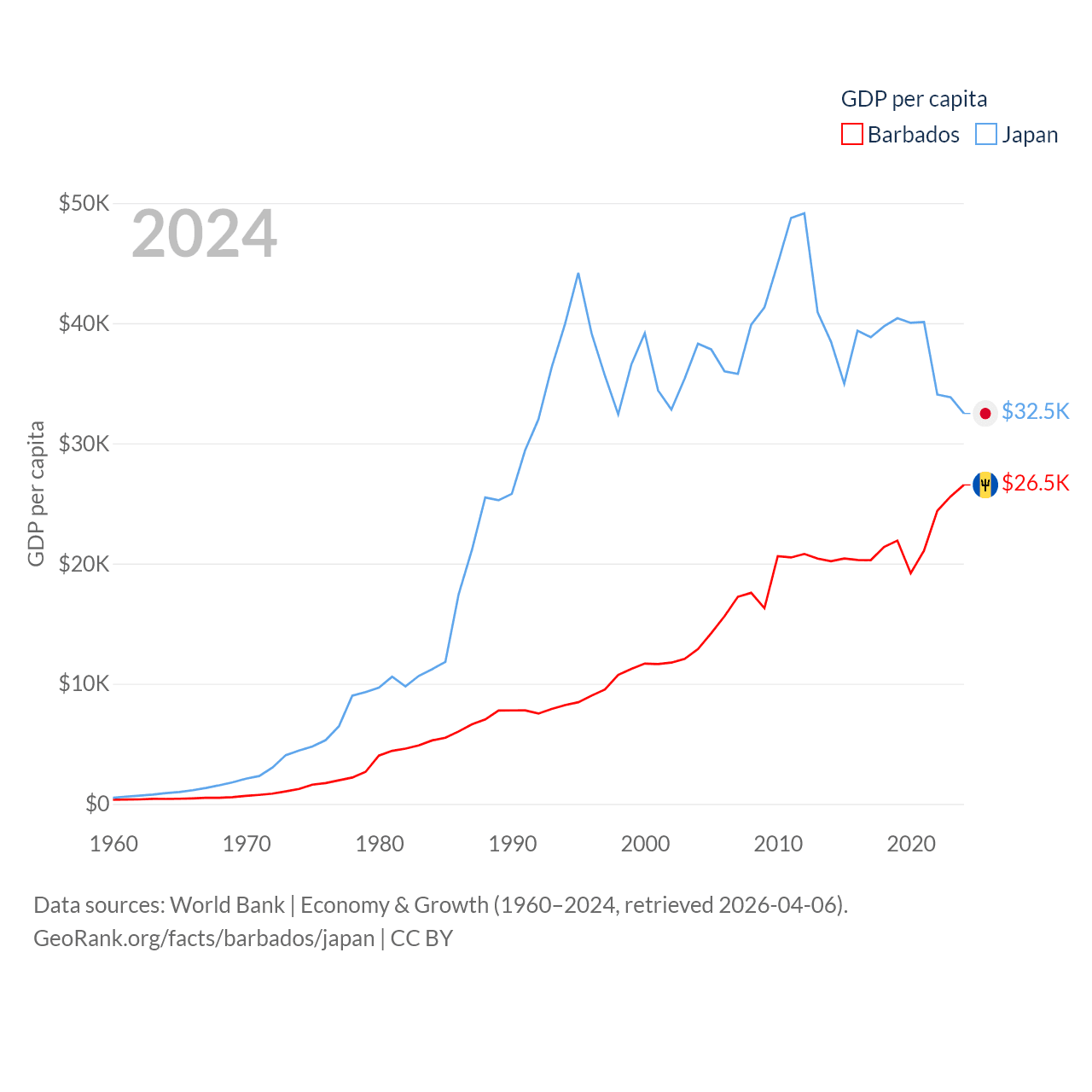 By GDP, Barbados ranks 157/197 ($7.5B) and Japan ranks 4/197 ($4.03T). By GDP per capita, Barbados ranks 46/197 ($26,545), while Japan ranks 38/197 ($32,487).