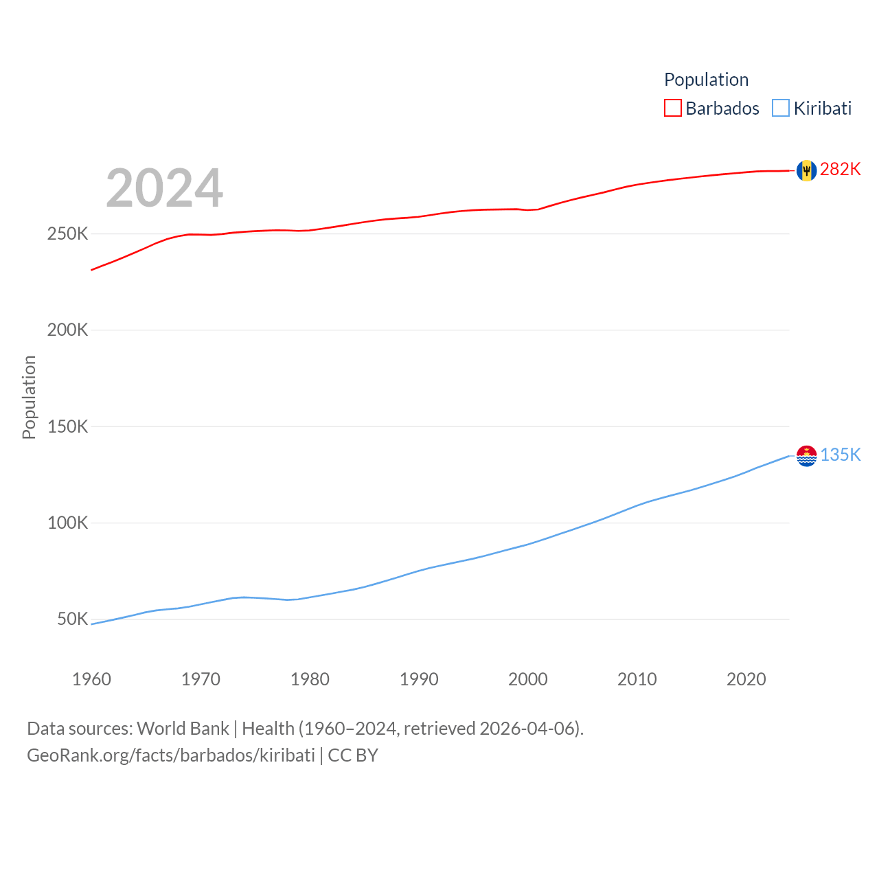Barbados has a population of 282K (ranked 175/197), compared with 135K in Kiribati (ranked 180/197). Barbados' land area is 166 sq mi versus 313 sq mi for Kiribati (ranked 184th vs. 173rd).