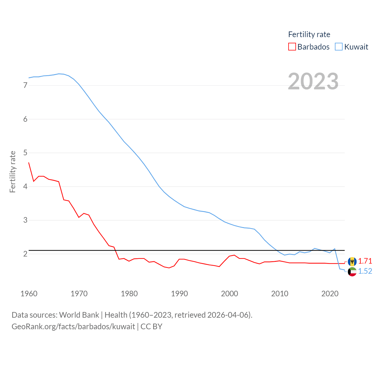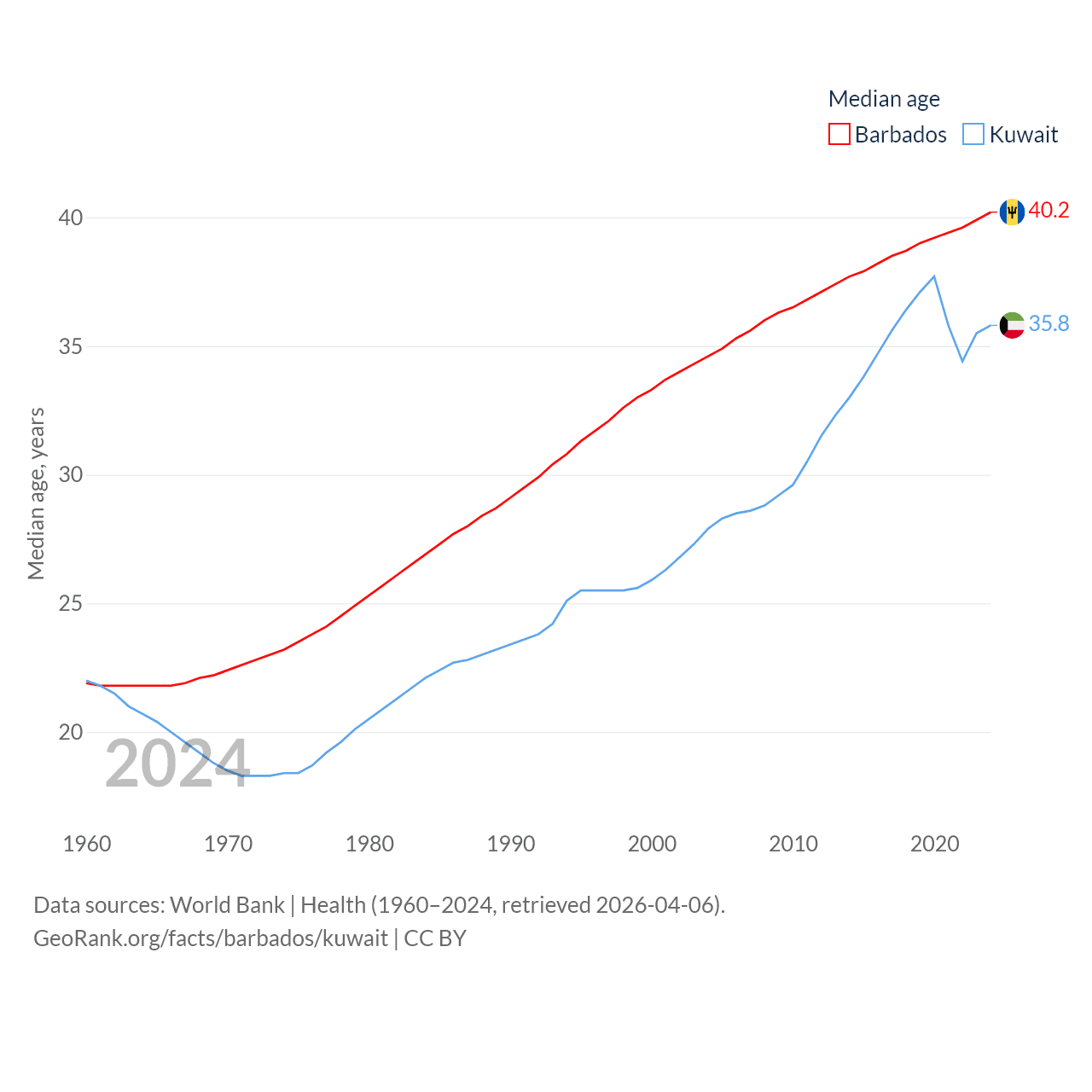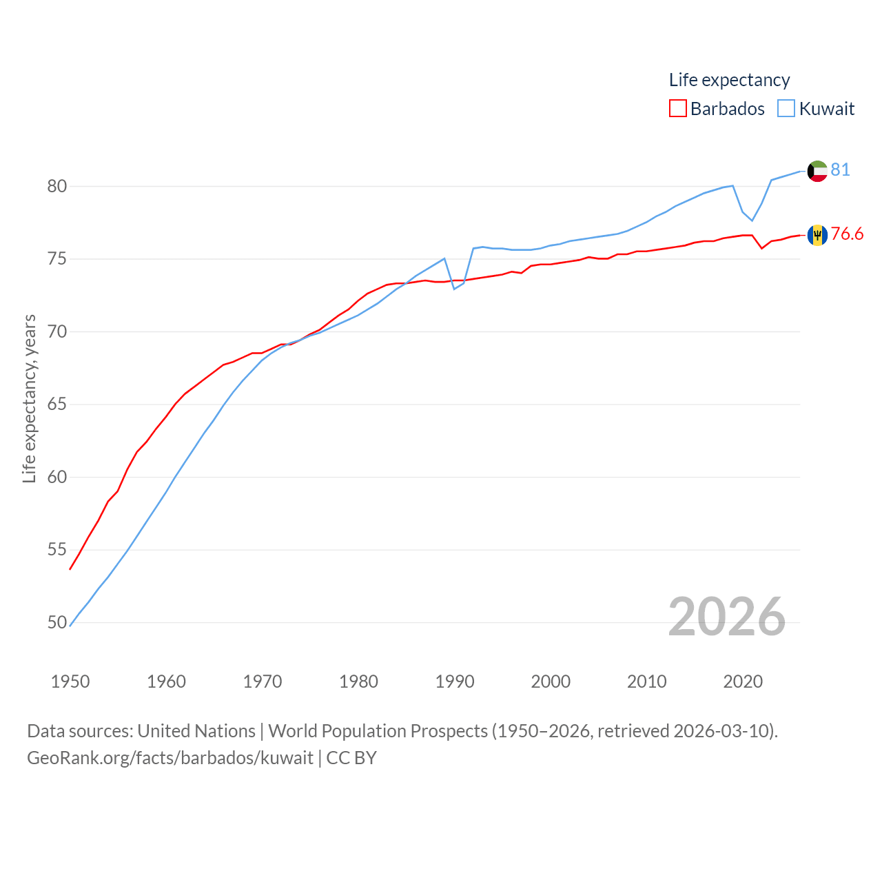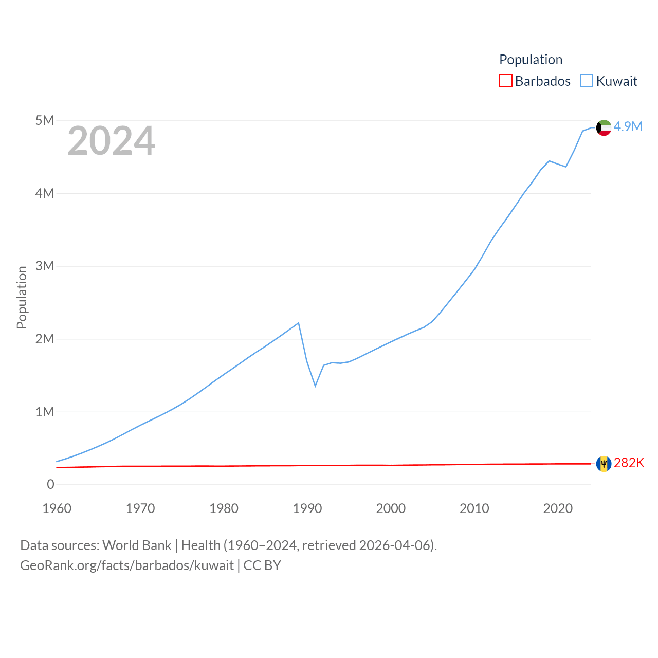 Barbados has a population of 282K (ranked 175/197), compared with 4.9M in Kuwait (ranked 127/197). Barbados' land area is 166 sq mi versus 6,880 sq mi for Kuwait (ranked 184th vs. 153rd).