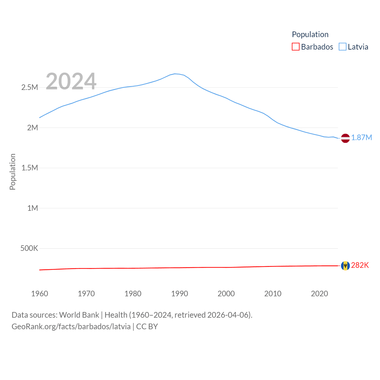 Barbados has a population of 282K (ranked 175/197), compared with 1.87M in Latvia (ranked 149/197). Barbados' land area is 166 sq mi versus 24,027 sq mi for Latvia (ranked 184th vs. 121st).