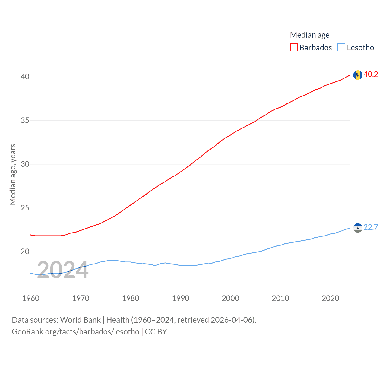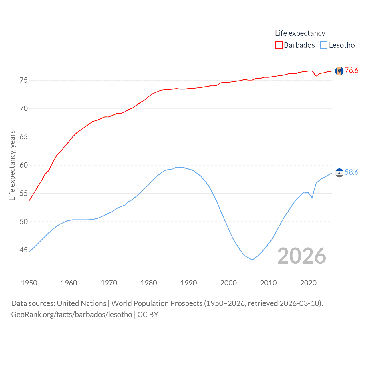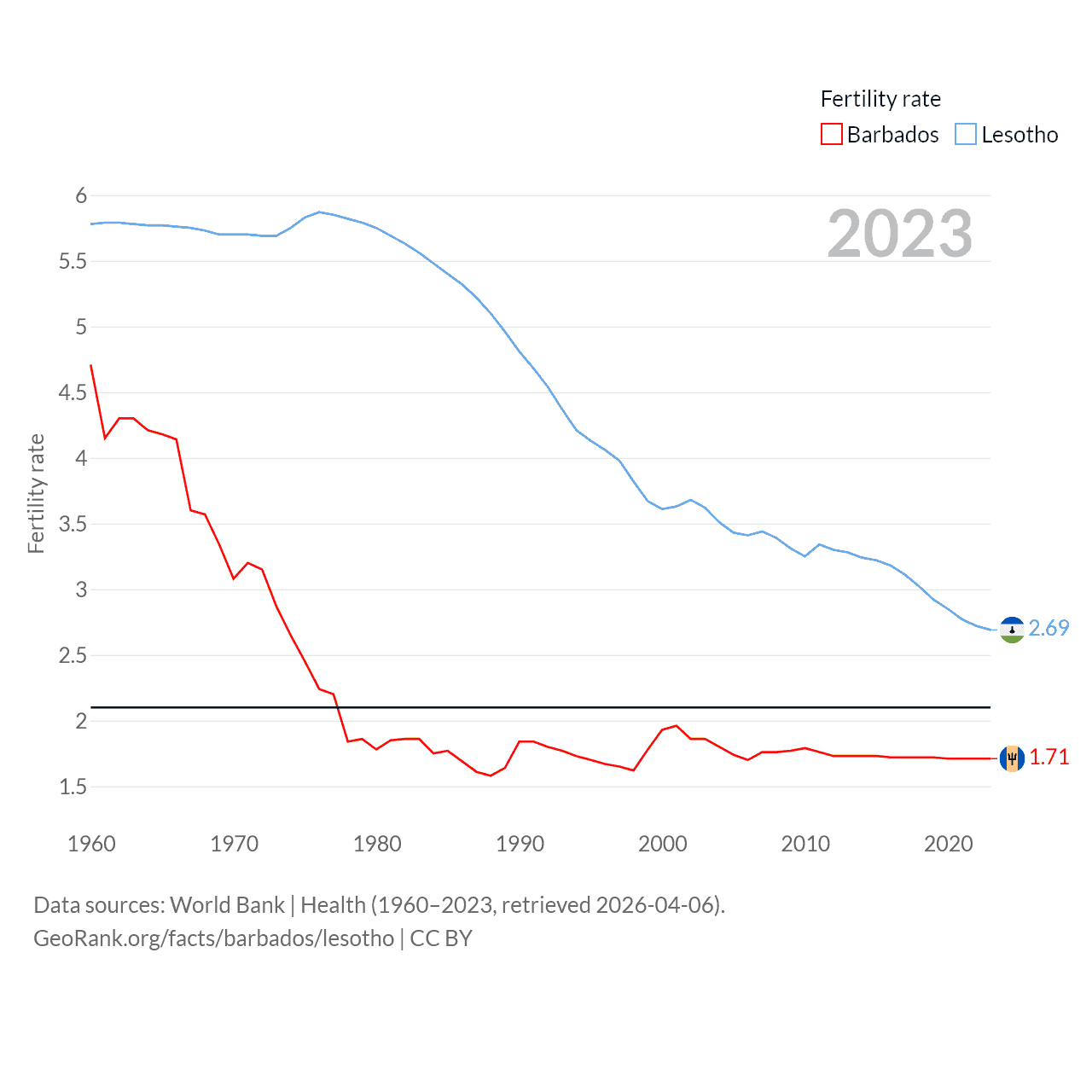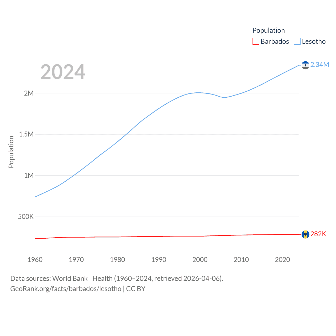 Barbados has a population of 282K (ranked 175/197), compared with 2.34M in Lesotho (ranked 145/197). Barbados' land area is 166 sq mi versus 11,722 sq mi for Lesotho (ranked 184th vs. 137th).