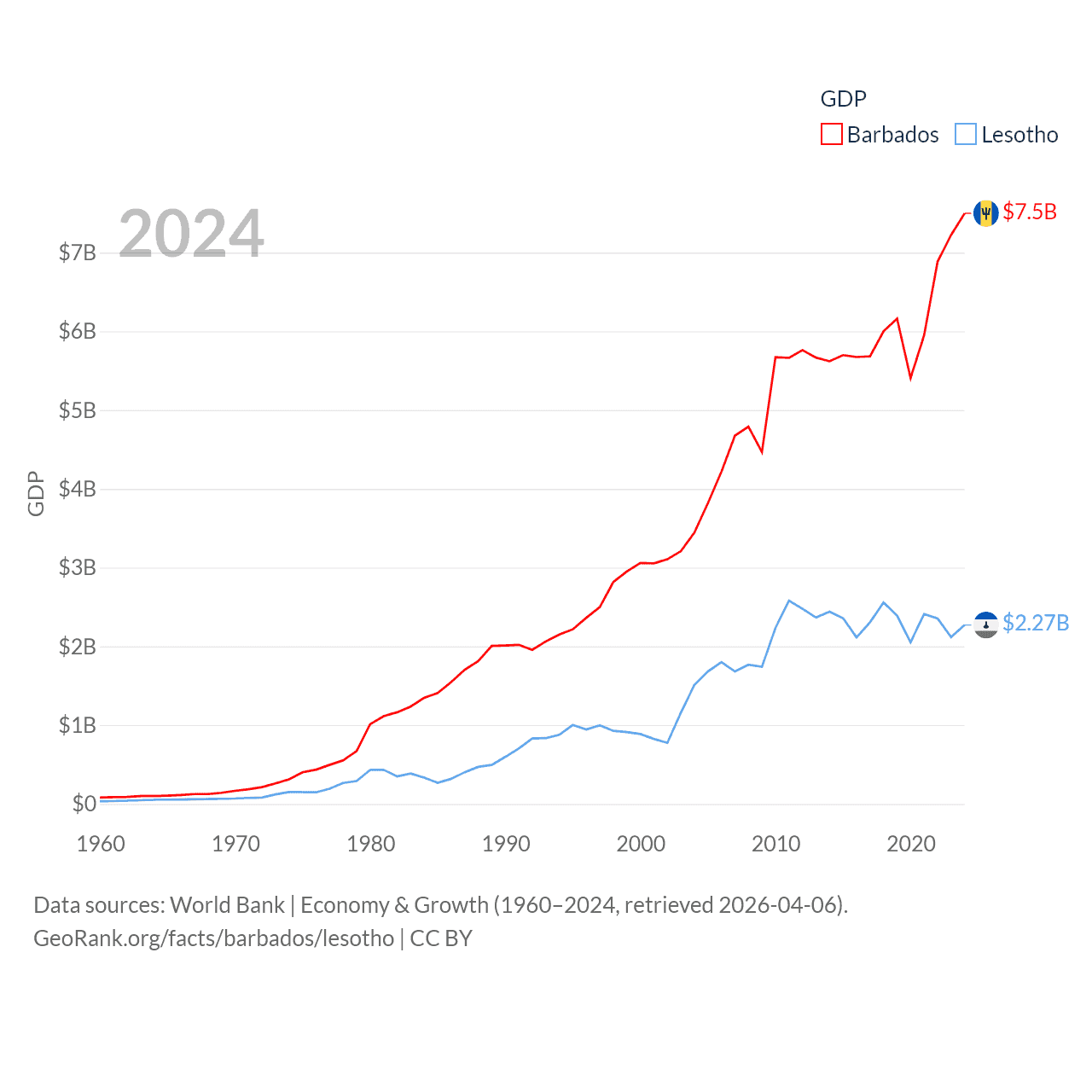 By GDP, Barbados ranks 157/197 ($7.5B) and Lesotho ranks 175/197 ($2.27B). By GDP per capita, Barbados ranks 46/197 ($26,545), while Lesotho ranks 181/197 ($972).