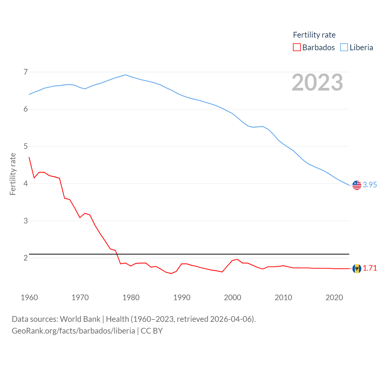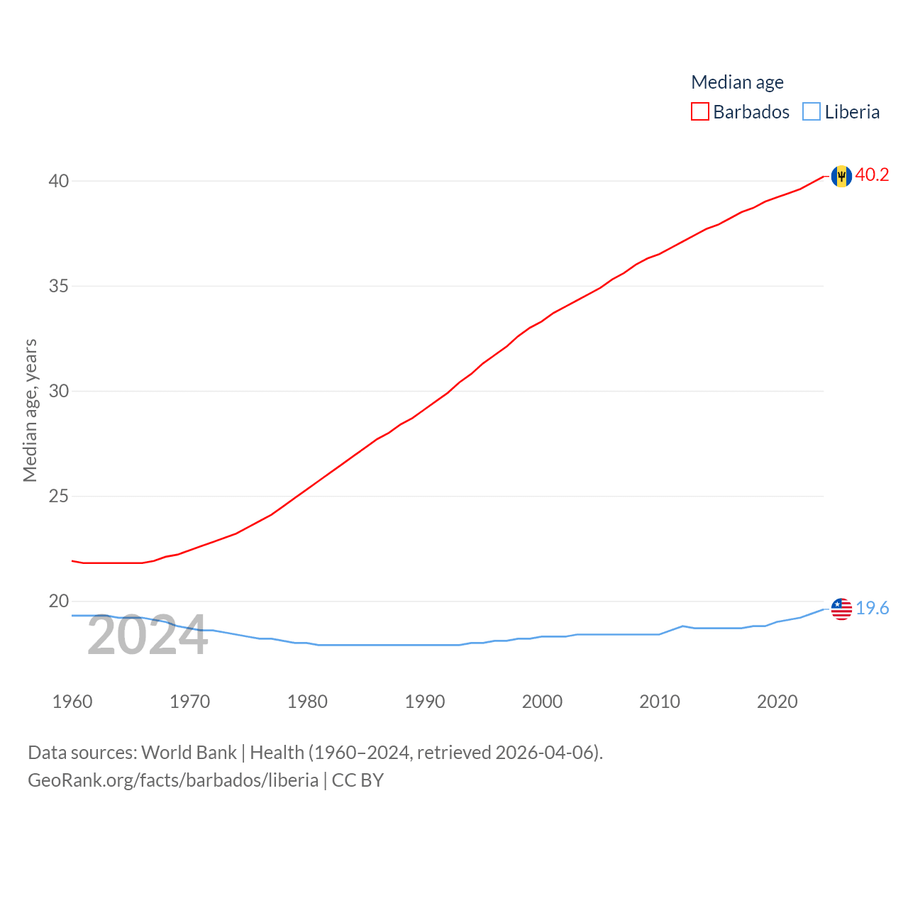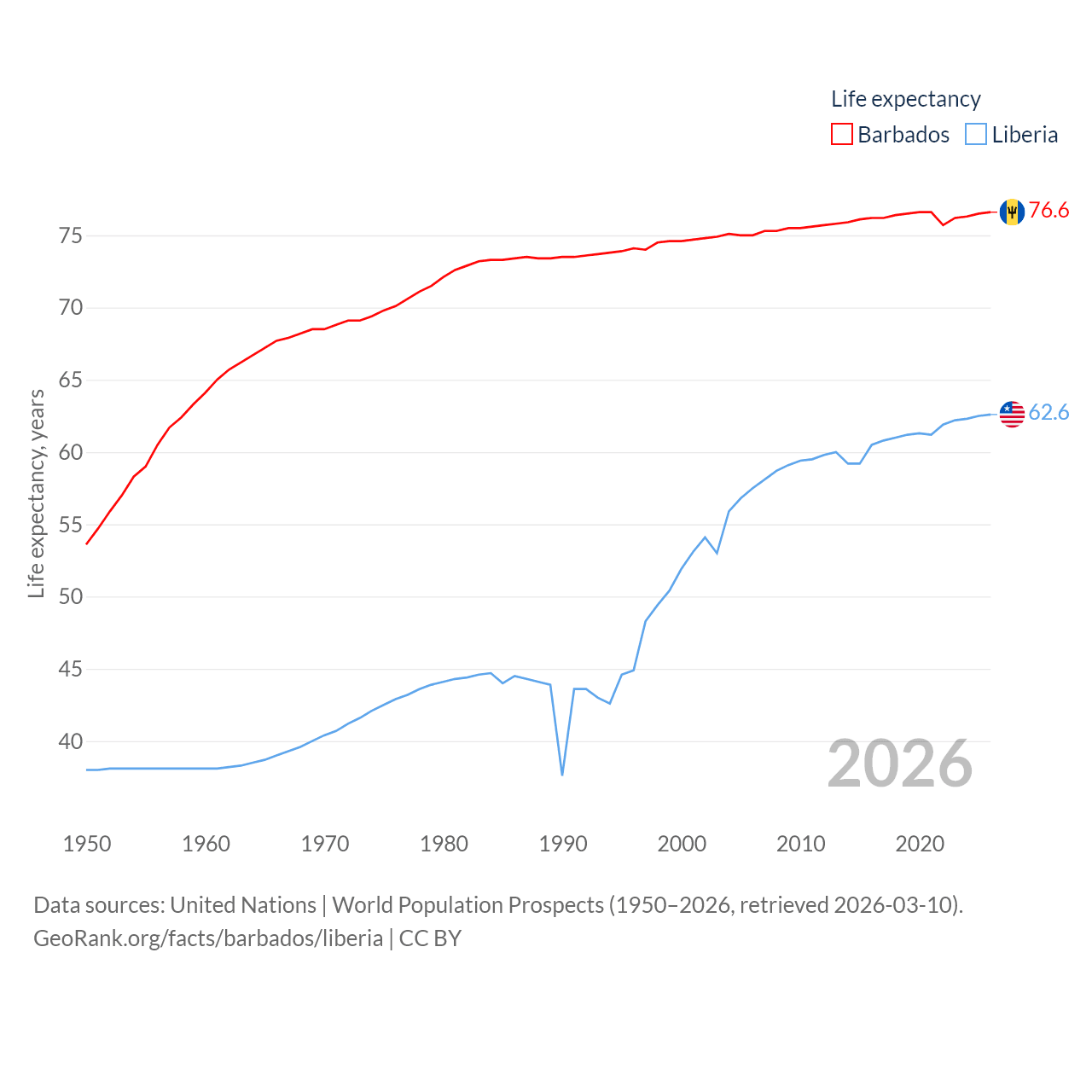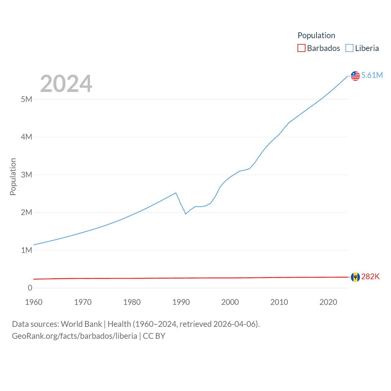 Barbados has a population of 282K (ranked 175/197), compared with 5.61M in Liberia (ranked 117/197). Barbados' land area is 166 sq mi versus 37,189 sq mi for Liberia (ranked 184th vs. 106th).