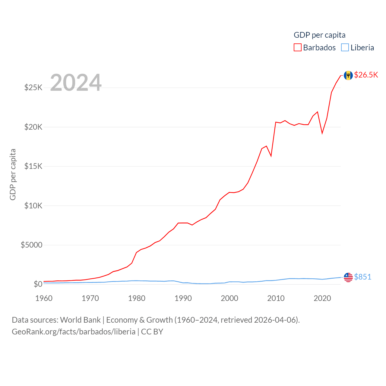 By GDP, Barbados ranks 157/197 ($7.5B) and Liberia ranks 163/197 ($4.78B). By GDP per capita, Barbados ranks 46/197 ($26,545), while Liberia ranks 184/197 ($851).