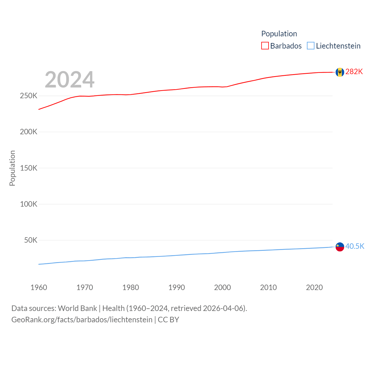 Barbados has a population of 282K (ranked 175/197), compared with 40.4K in Liechtenstein (ranked 190/197). Barbados' land area is 166 sq mi versus 61.8 sq mi for Liechtenstein (ranked 184th vs. 192nd).