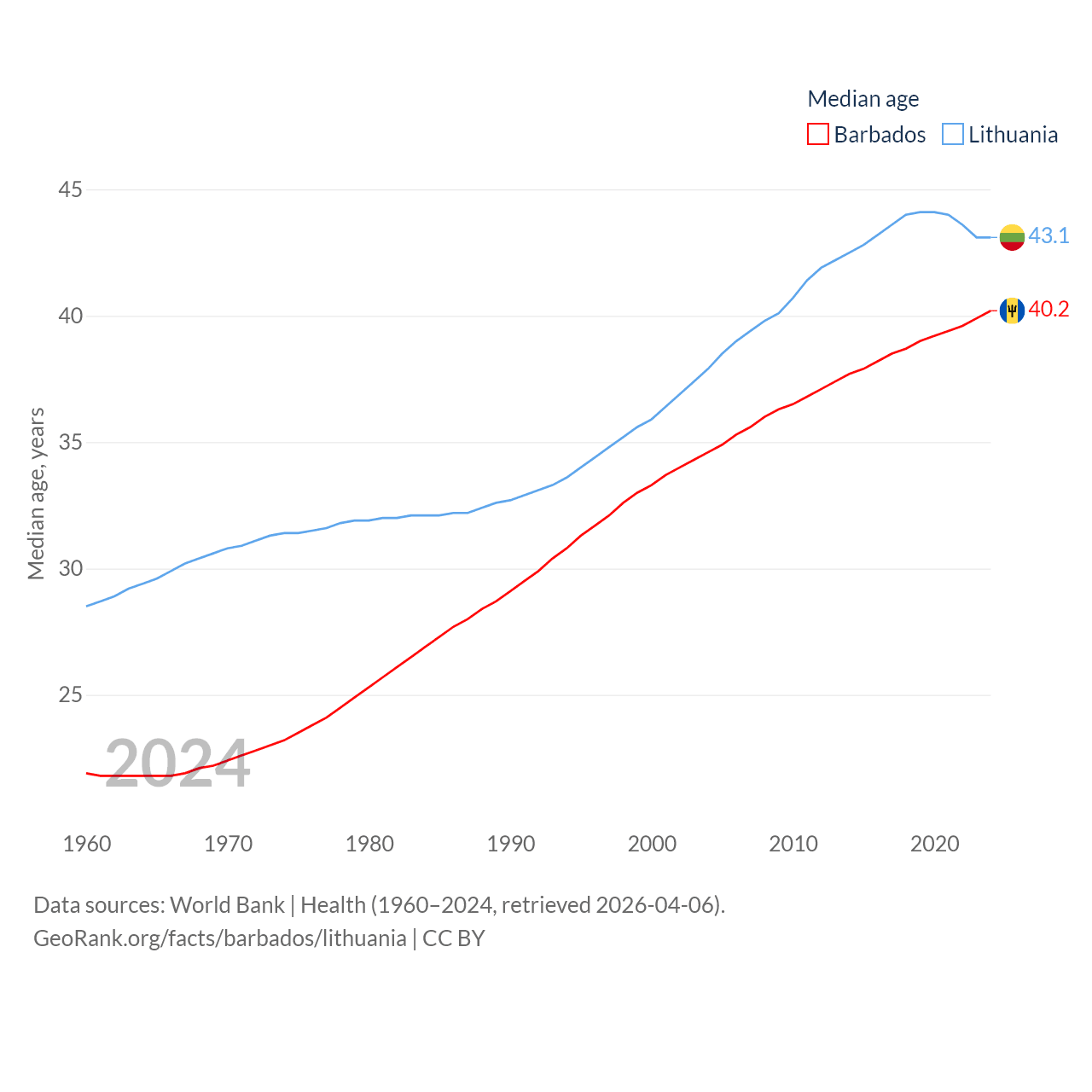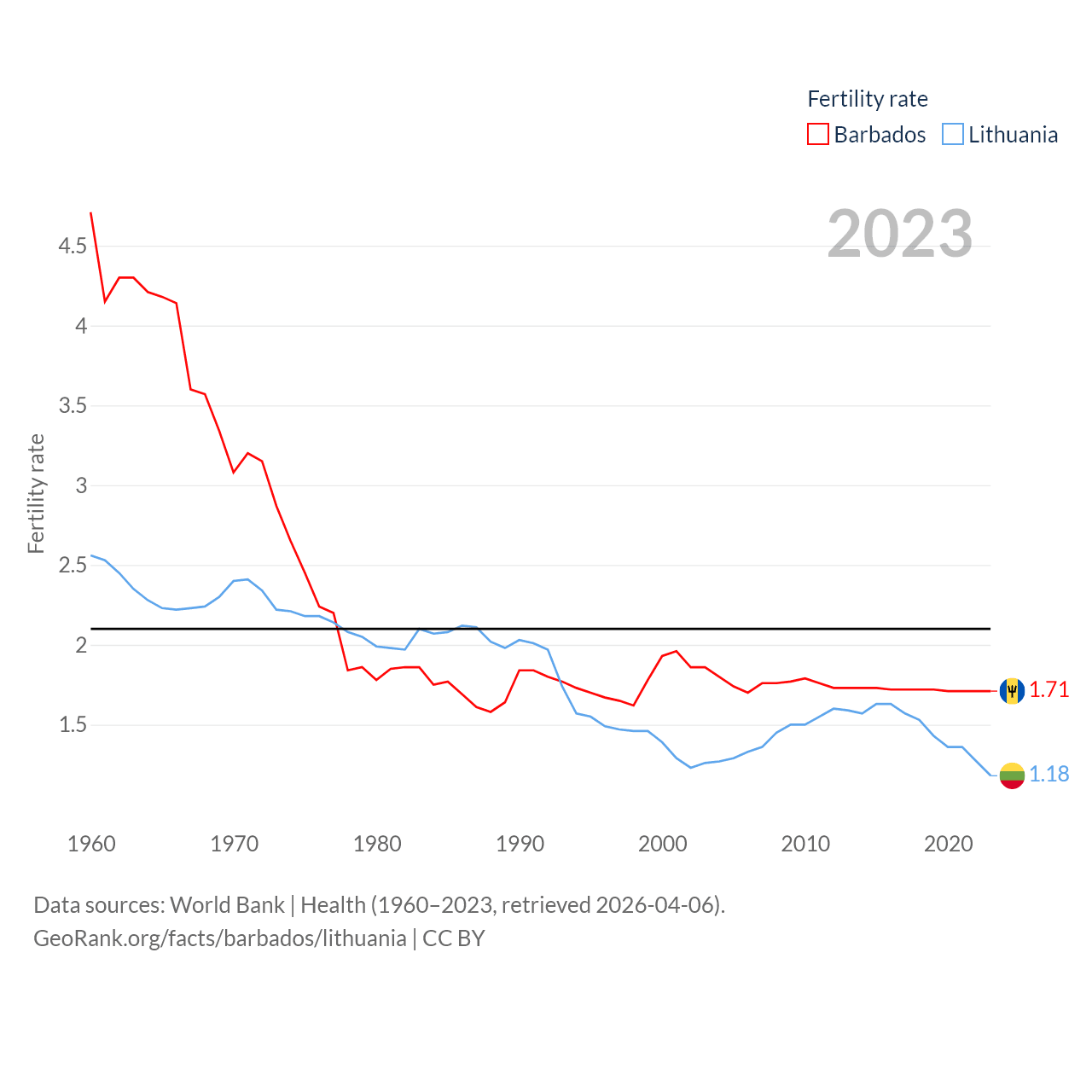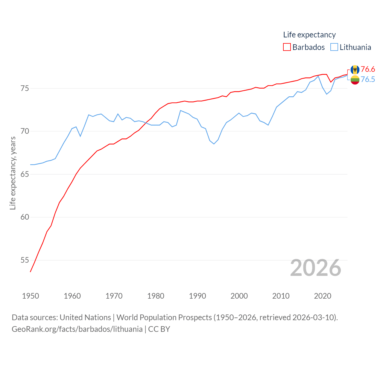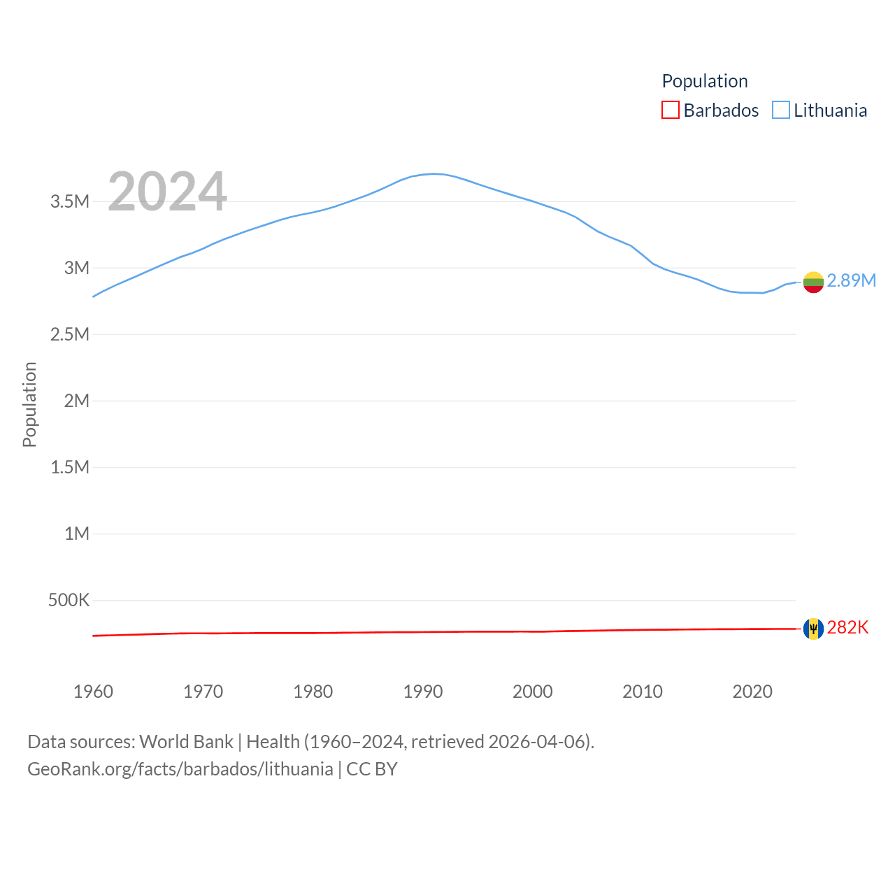 Barbados has a population of 282K (ranked 175/197), compared with 2.89M in Lithuania (ranked 137/197). Barbados' land area is 166 sq mi versus 24,170 sq mi for Lithuania (ranked 184th vs. 120th).