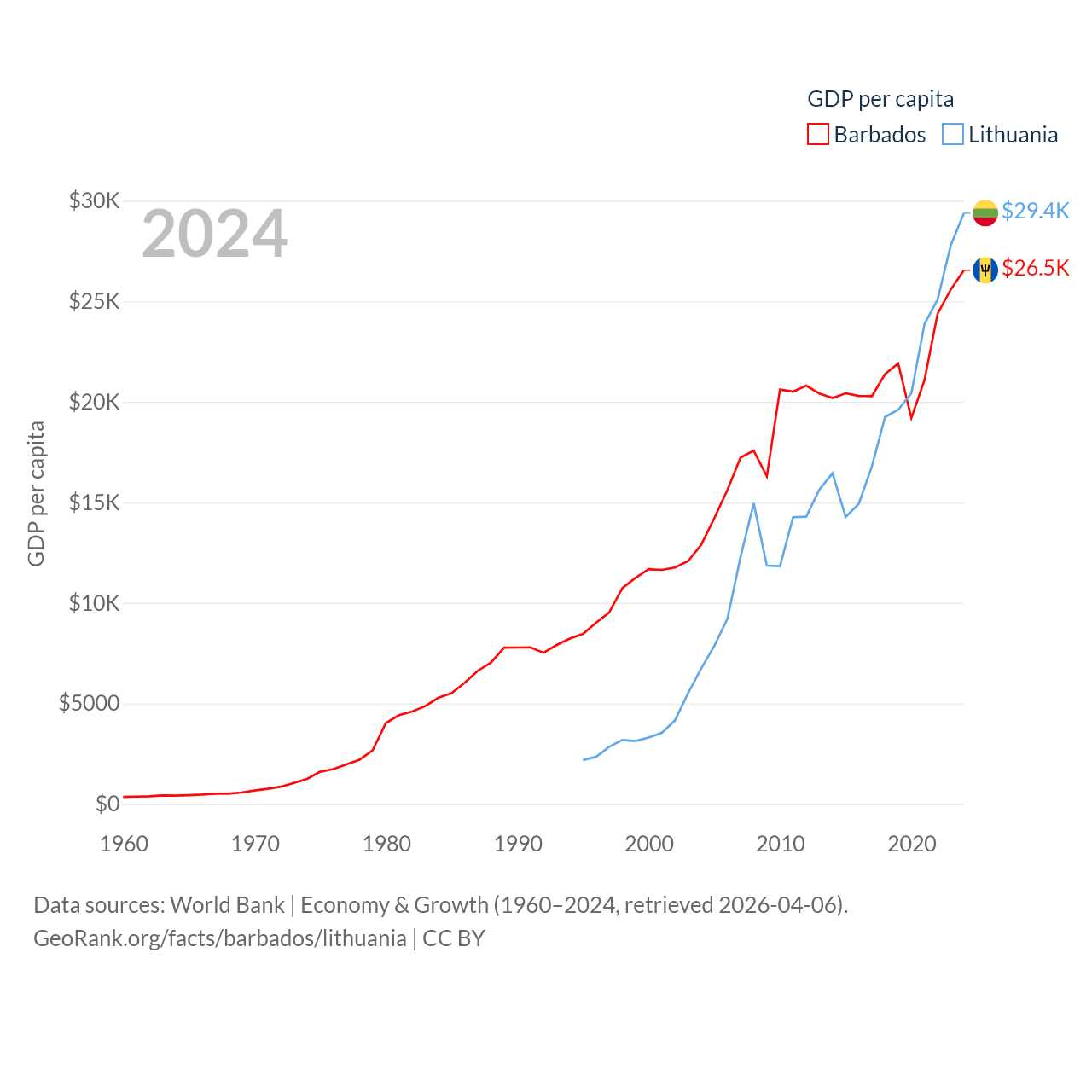 By GDP, Barbados ranks 157/197 ($7.5B) and Lithuania ranks 79/197 ($84.9B). By GDP per capita, Barbados ranks 46/197 ($26,545), while Lithuania ranks 43/197 ($29,384).