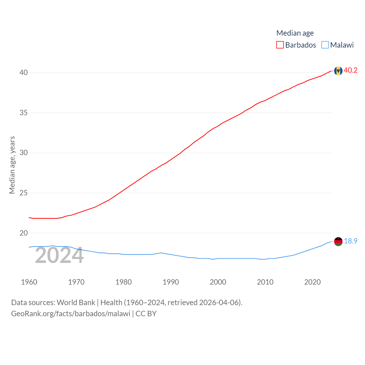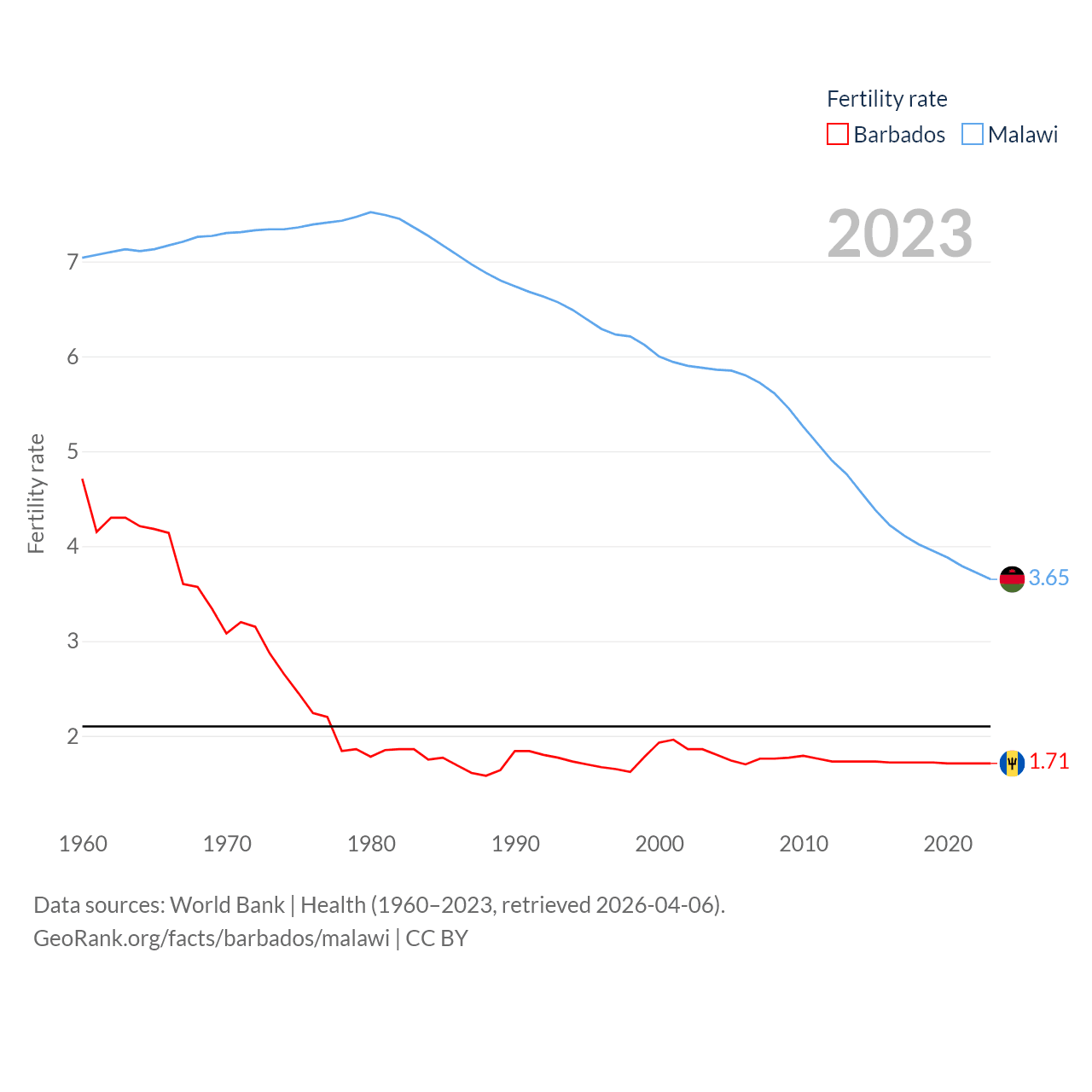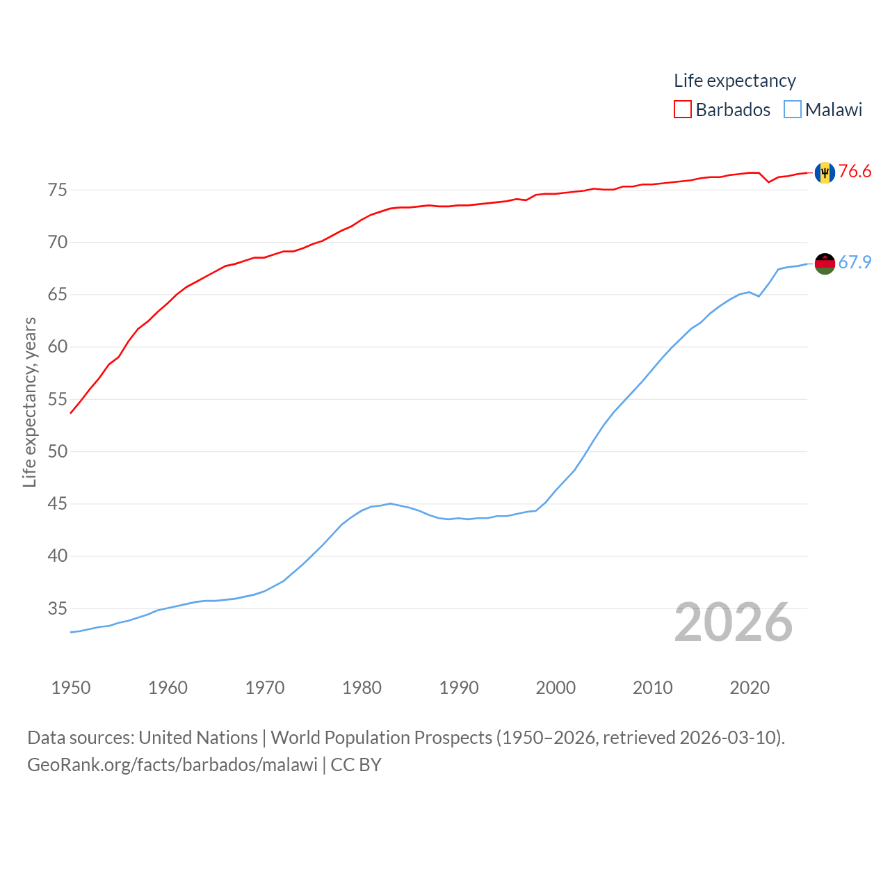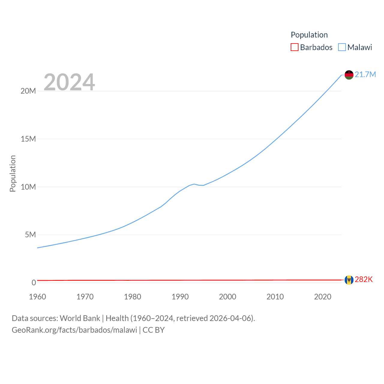 Barbados has a population of 282K (ranked 175/197), compared with 21.7M in Malawi (ranked 62/197). Barbados' land area is 166 sq mi versus 36,402 sq mi for Malawi (ranked 184th vs. 107th).