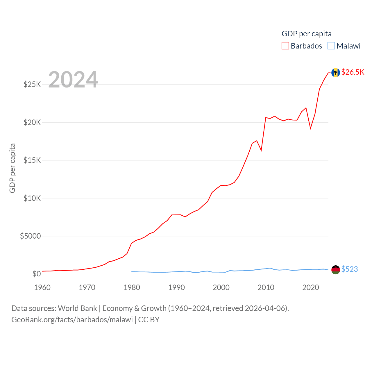 By GDP, Barbados ranks 157/197 ($7.5B) and Malawi ranks 151/197 ($11.3B). By GDP per capita, Barbados ranks 46/197 ($26,545), while Malawi ranks 194/197 ($523).