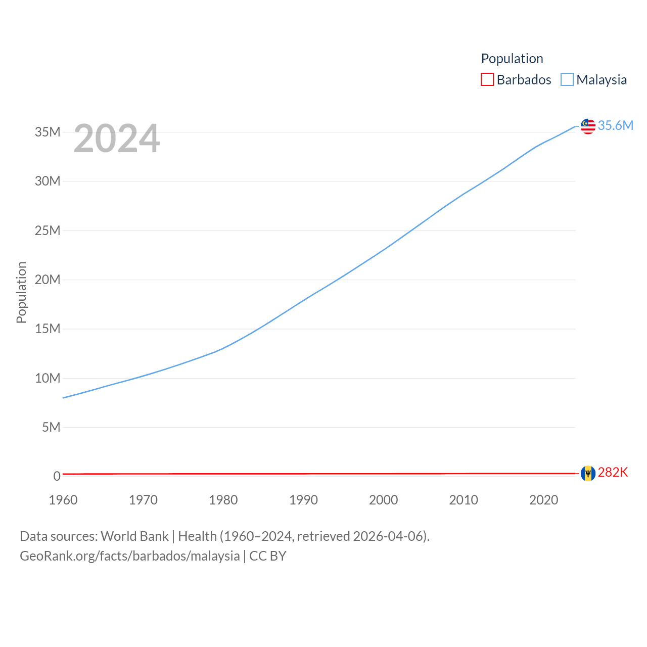Barbados has a population of 282K (ranked 175/197), compared with 35.6M in Malaysia (ranked 44/197). Barbados' land area is 166 sq mi versus 126,854 sq mi for Malaysia (ranked 184th vs. 65th).
