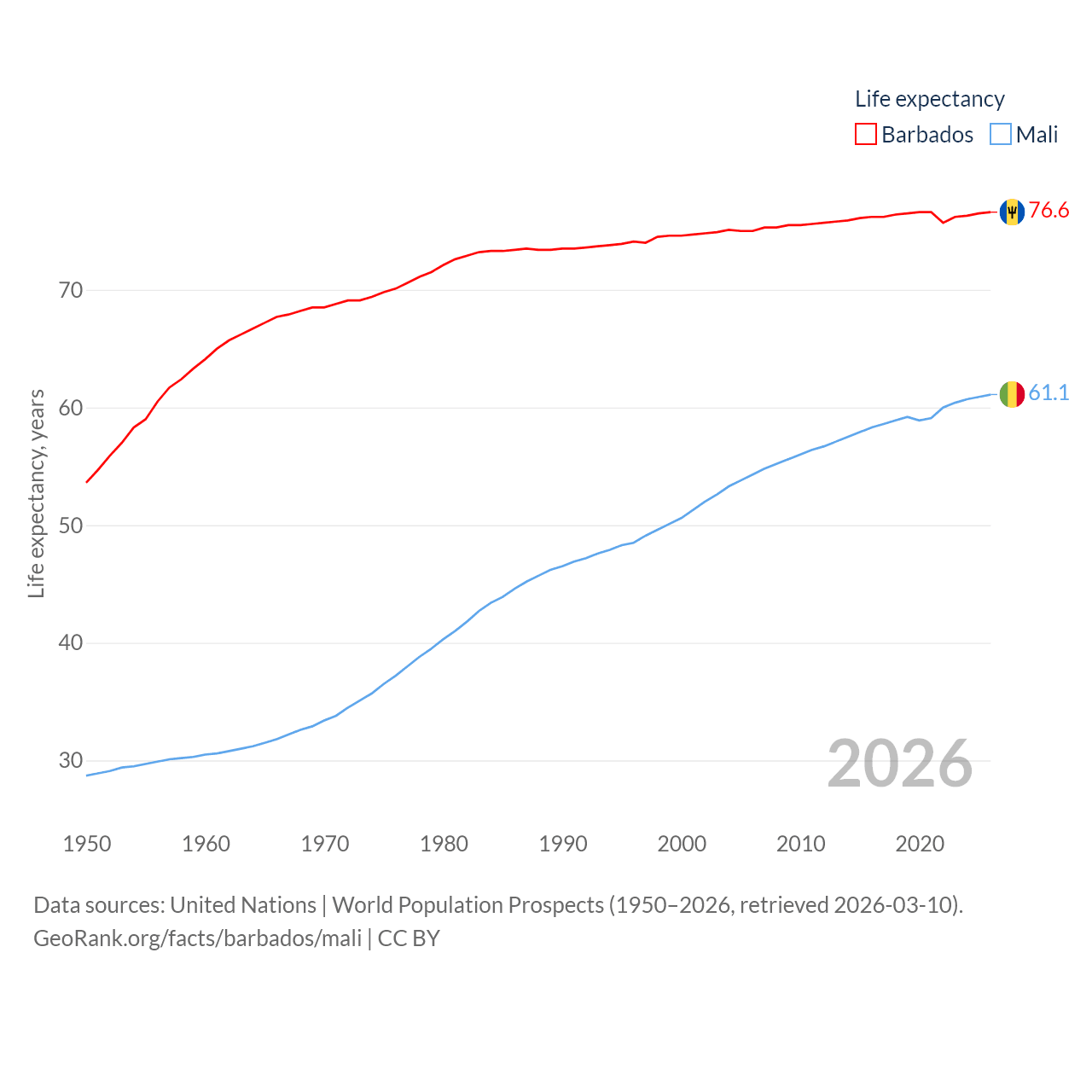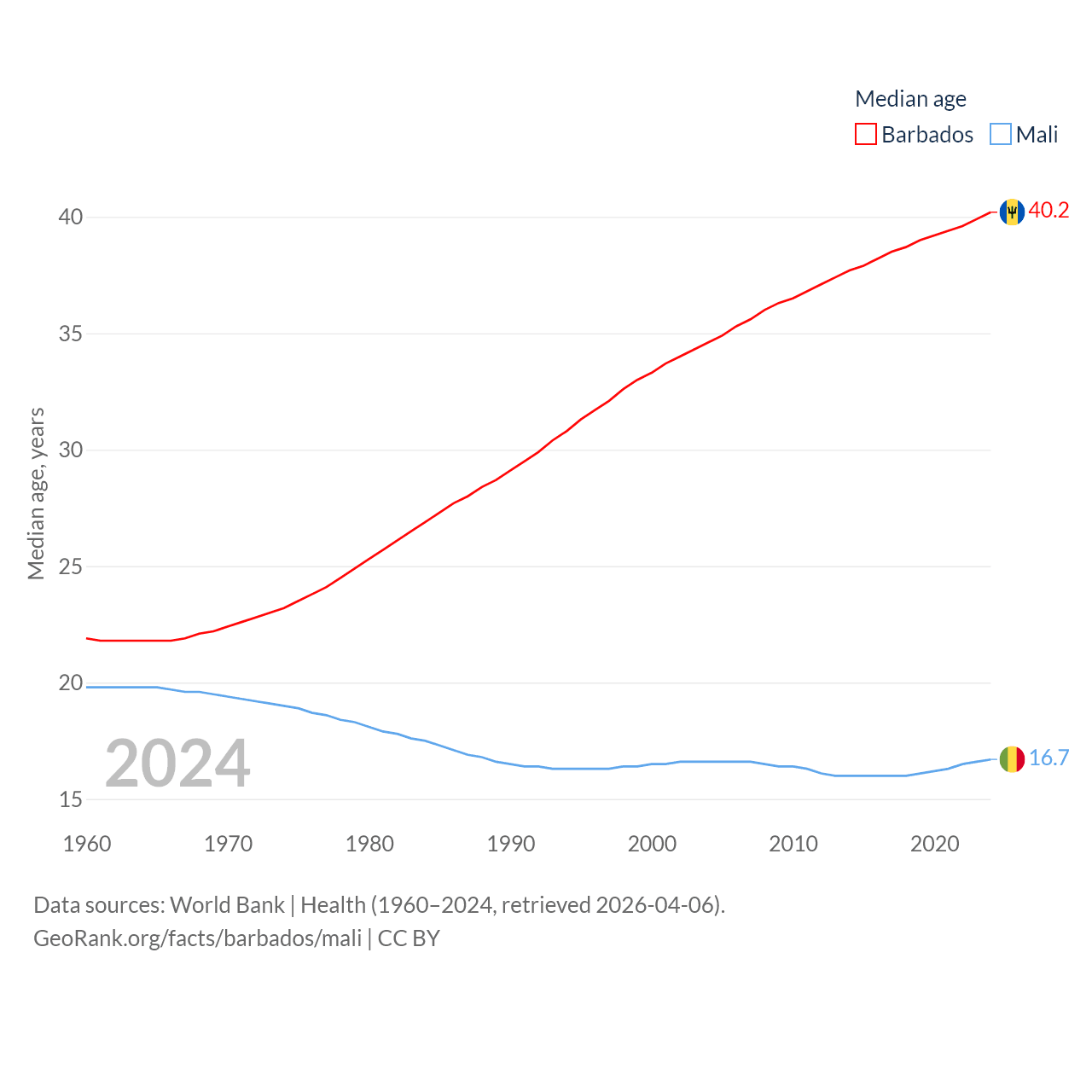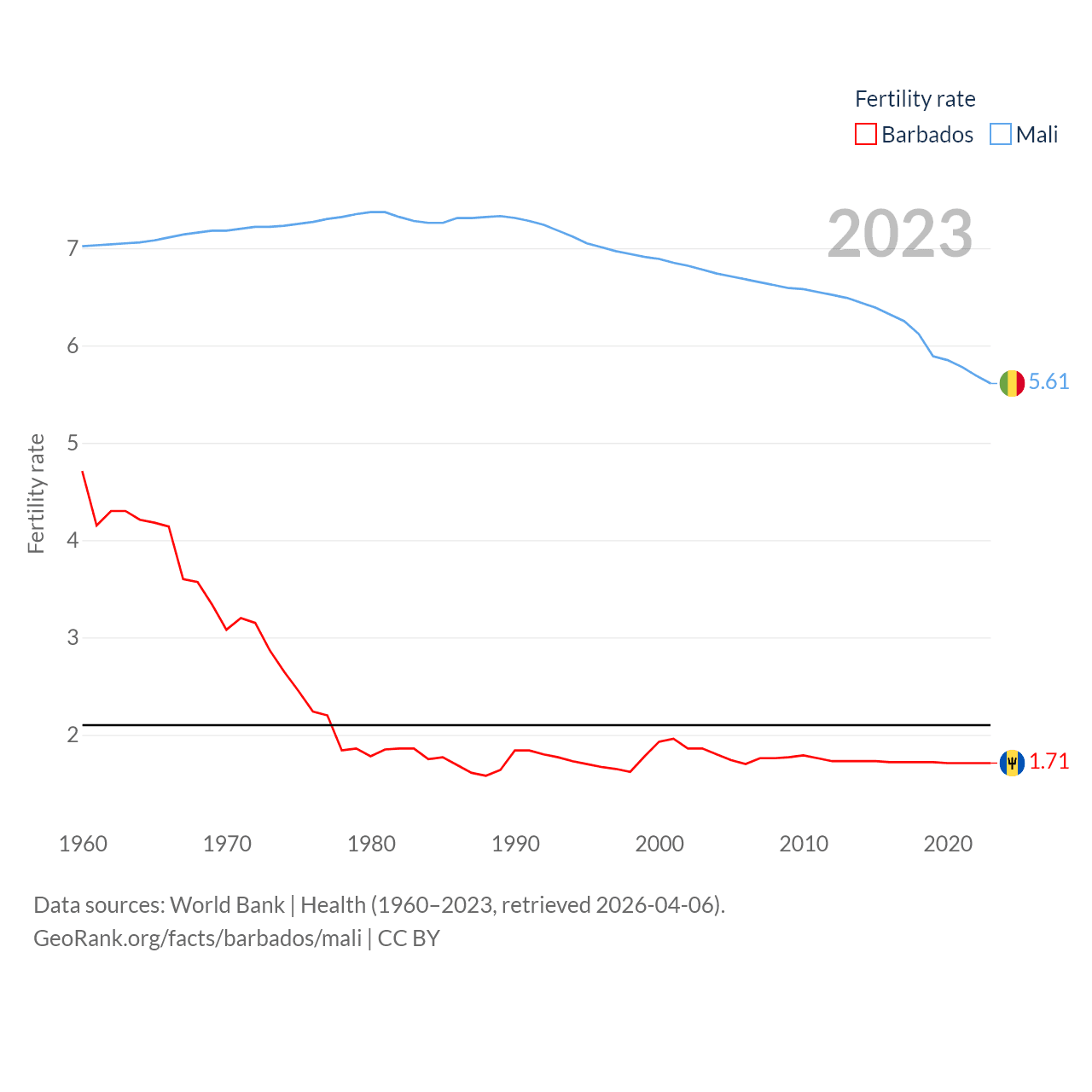 Barbados has a population of 282K (ranked 175/197), compared with 24.5M in Mali (ranked 58/197). Barbados' land area is 166 sq mi versus 471,118 sq mi for Mali (ranked 184th vs. 23rd).
