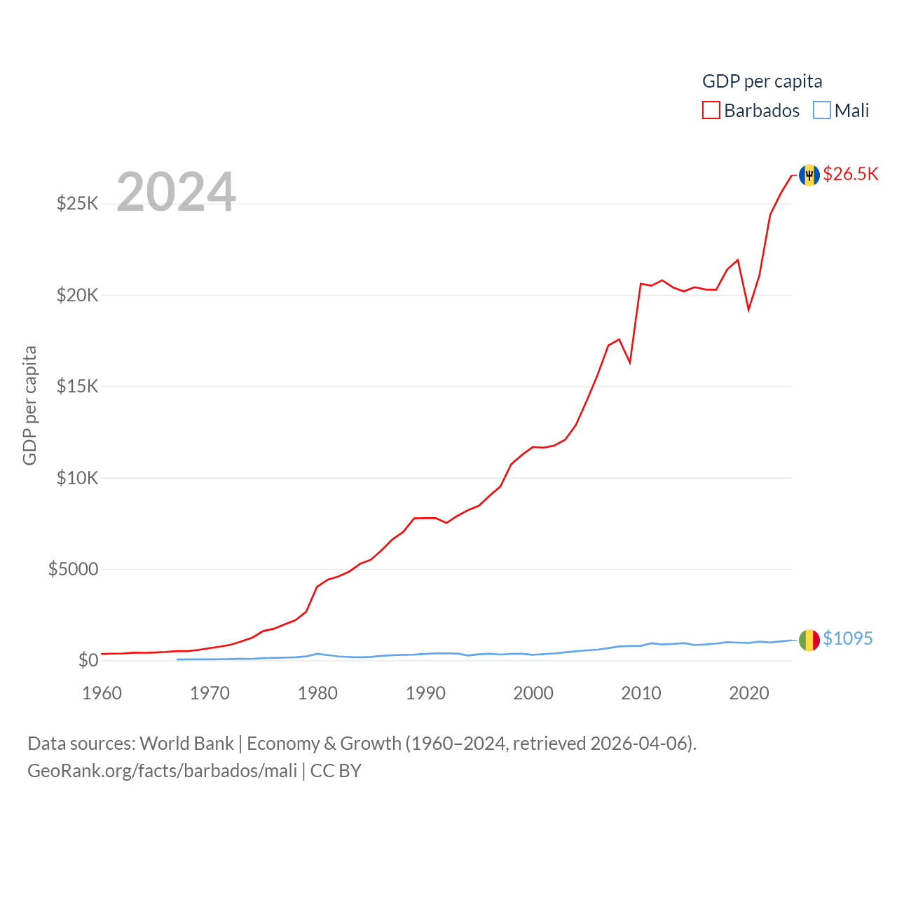 By GDP, Barbados ranks 157/197 ($7.5B) and Mali ranks 113/197 ($26.8B). By GDP per capita, Barbados ranks 46/197 ($26,545), while Mali ranks 173/197 ($1,095).