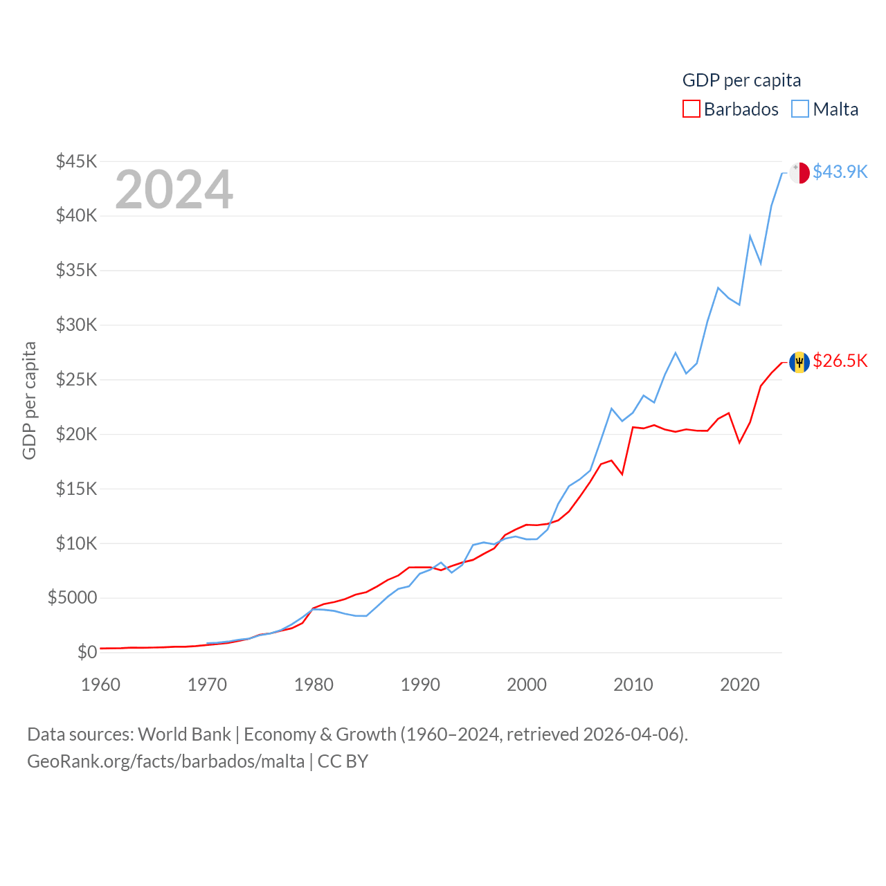 By GDP, Barbados ranks 157/197 ($7.5B) and Malta ranks 119/197 ($25B). By GDP per capita, Barbados ranks 46/197 ($26,545), while Malta ranks 28/197 ($43,899).