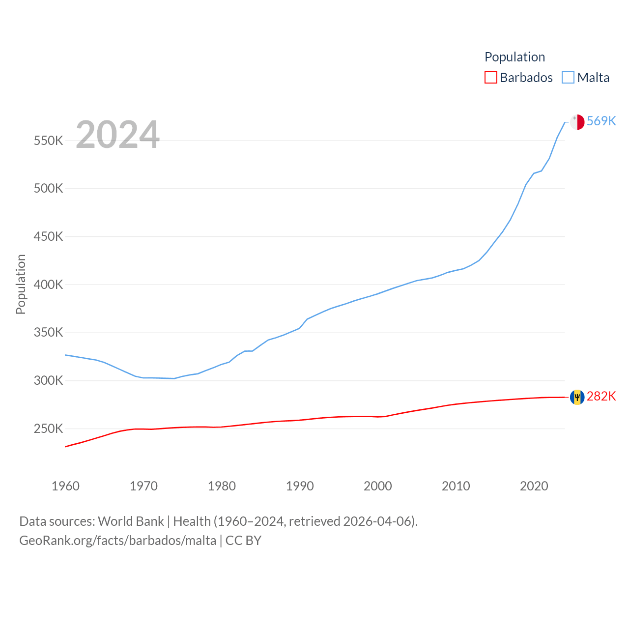 Barbados has a population of 282K (ranked 175/197), compared with 569K in Malta (ranked 167/197). Barbados' land area is 166 sq mi versus 123.6 sq mi for Malta (ranked 184th vs. 187th).