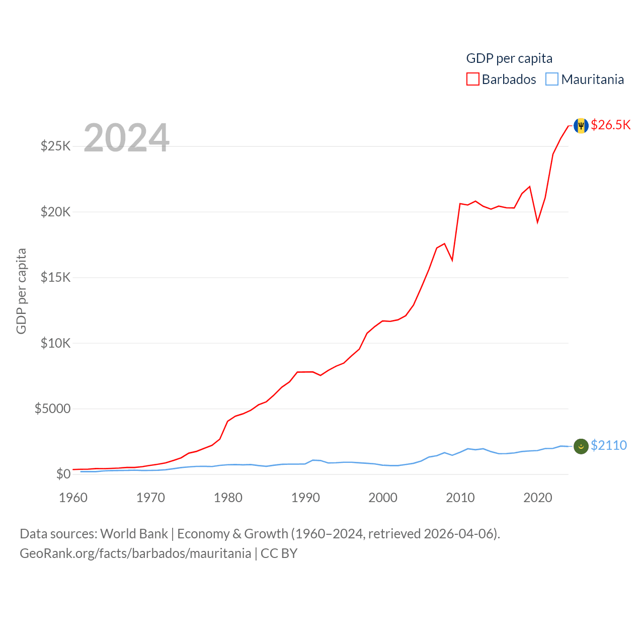 By GDP, Barbados ranks 157/197 ($7.5B) and Mauritania ranks 153/197 ($10.9B). By GDP per capita, Barbados ranks 46/197 ($26,545), while Mauritania ranks 156/197 ($2,110).