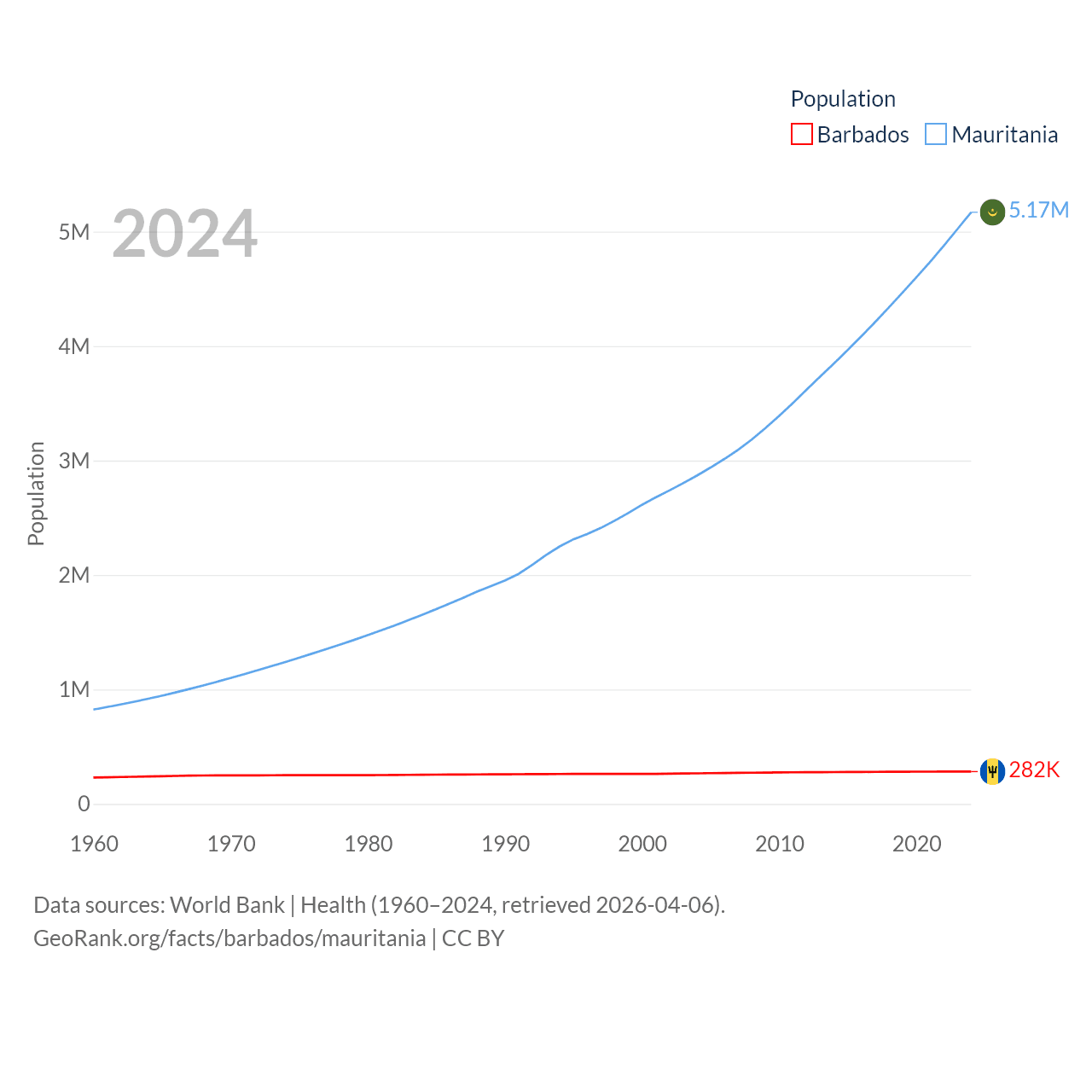 Barbados has a population of 282K (ranked 175/197), compared with 5.17M in Mauritania (ranked 125/197). Barbados' land area is 166 sq mi versus 397,955 sq mi for Mauritania (ranked 184th vs. 28th).