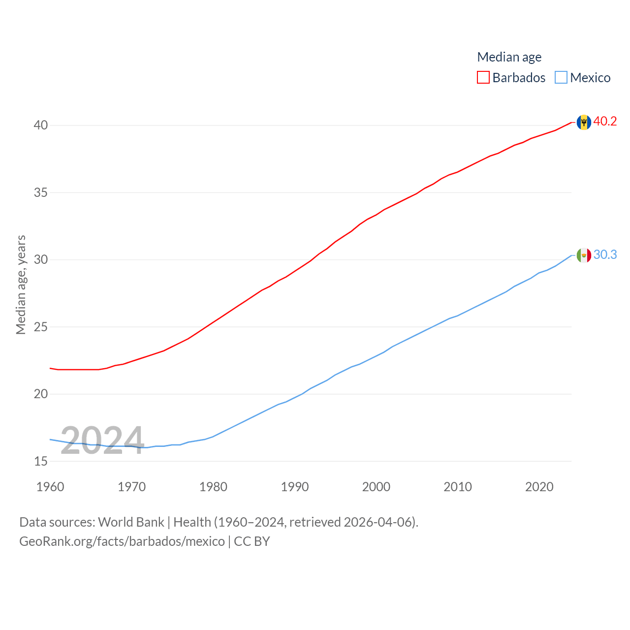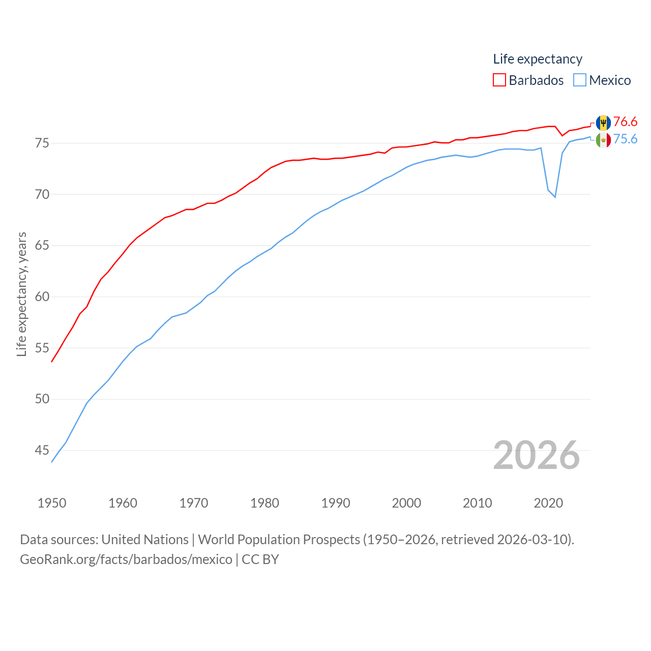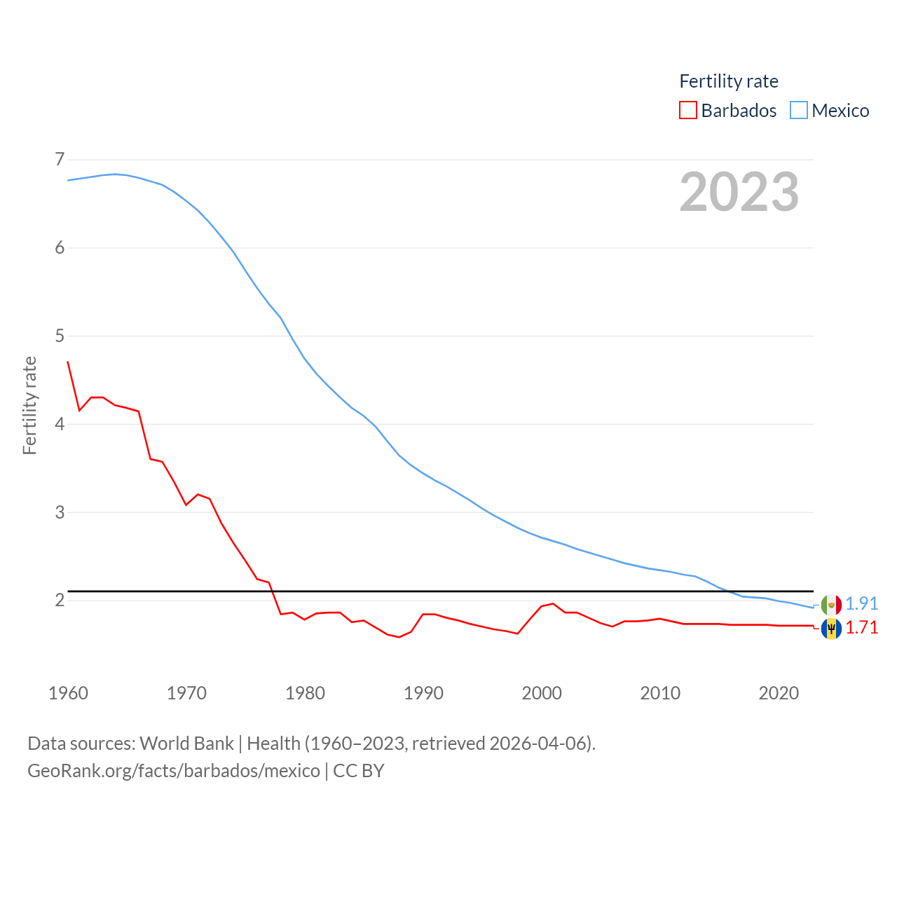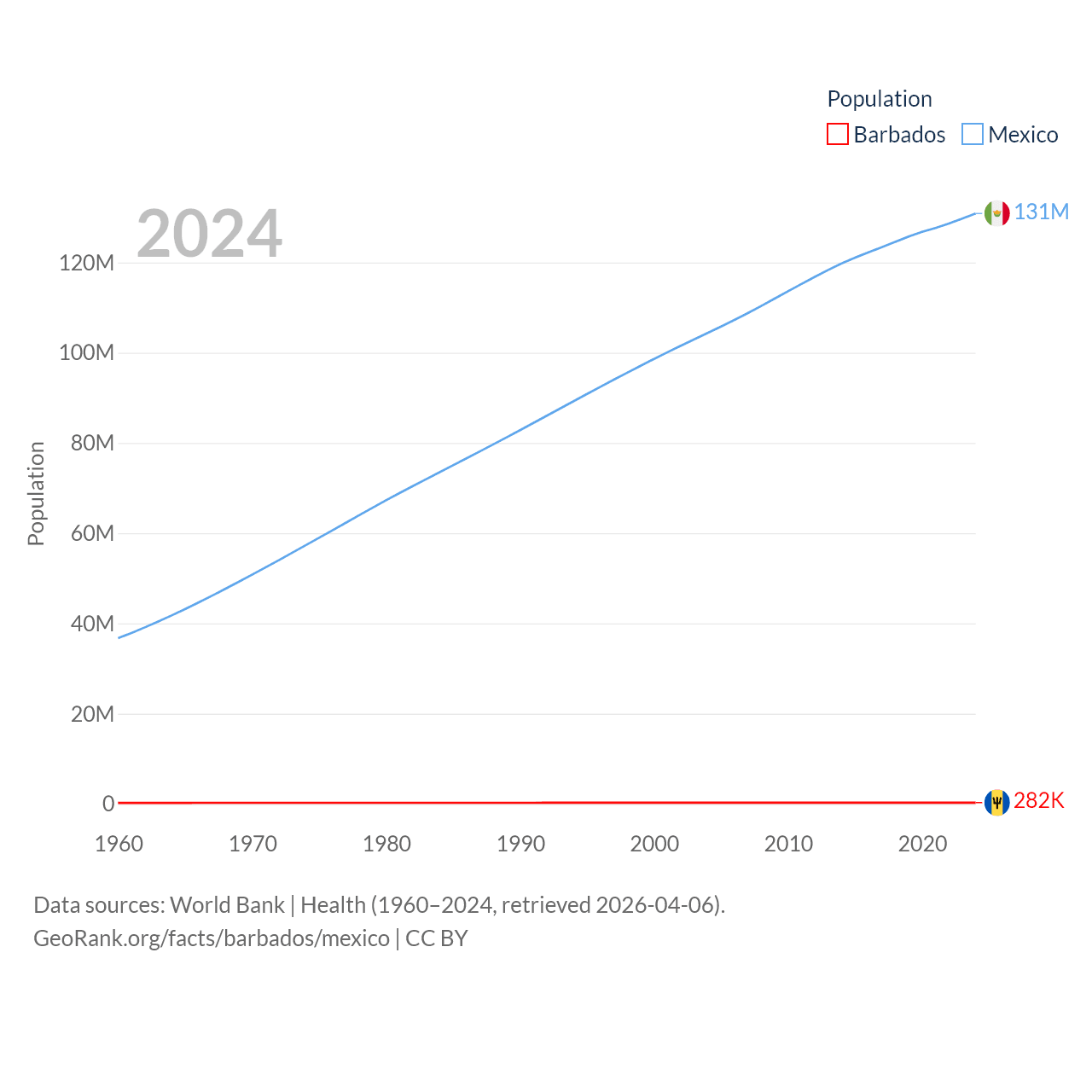Barbados has a population of 282K (ranked 175/197), compared with 131M in Mexico (ranked 11/197). Barbados' land area is 166 sq mi versus 750,563 sq mi for Mexico (ranked 184th vs. 13th).