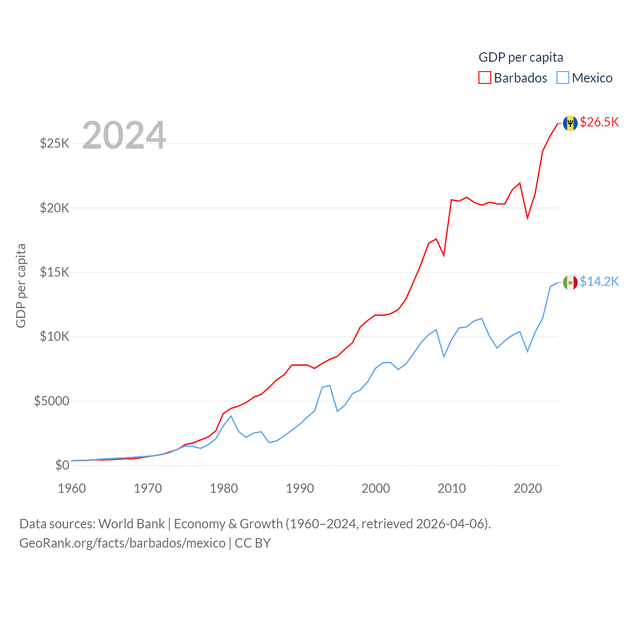 By GDP, Barbados ranks 157/197 ($7.5B) and Mexico ranks 13/197 ($1.86T). By GDP per capita, Barbados ranks 46/197 ($26,545), while Mexico ranks 69/197 ($14,186).