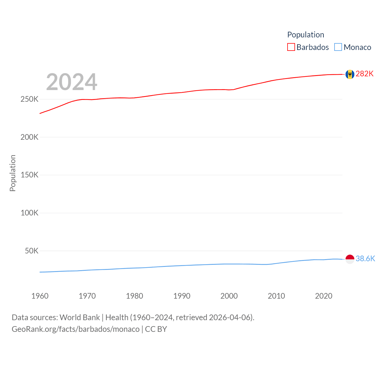Barbados has a population of 282K (ranked 175/197), compared with 38.6K in Monaco (ranked 191/197). Barbados' land area is 166 sq mi versus 0.8 sq mi for Monaco (ranked 184th vs. 196th).
