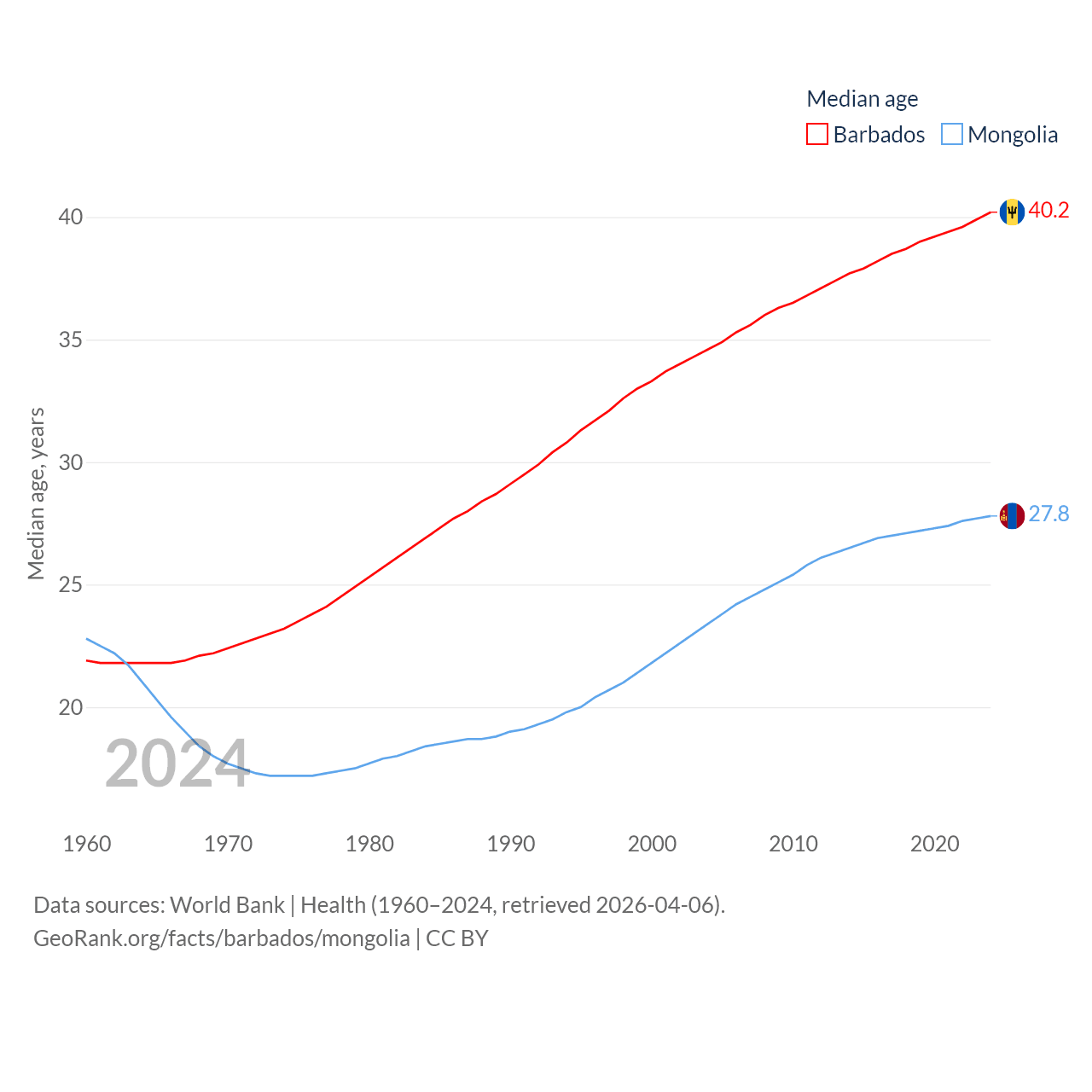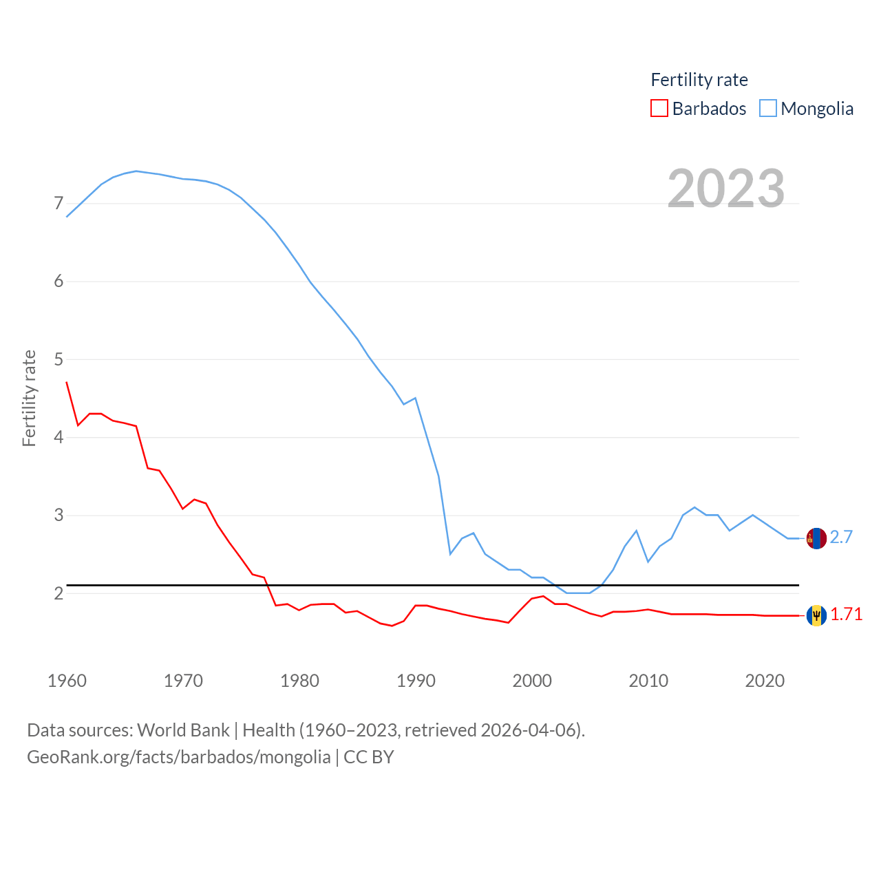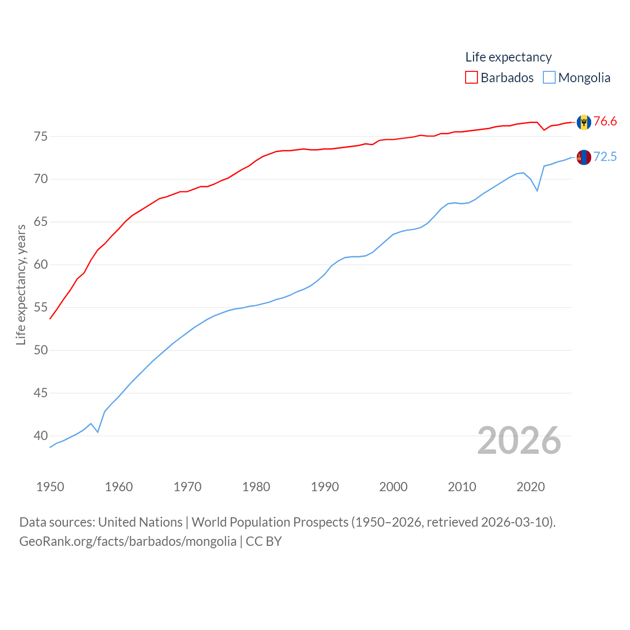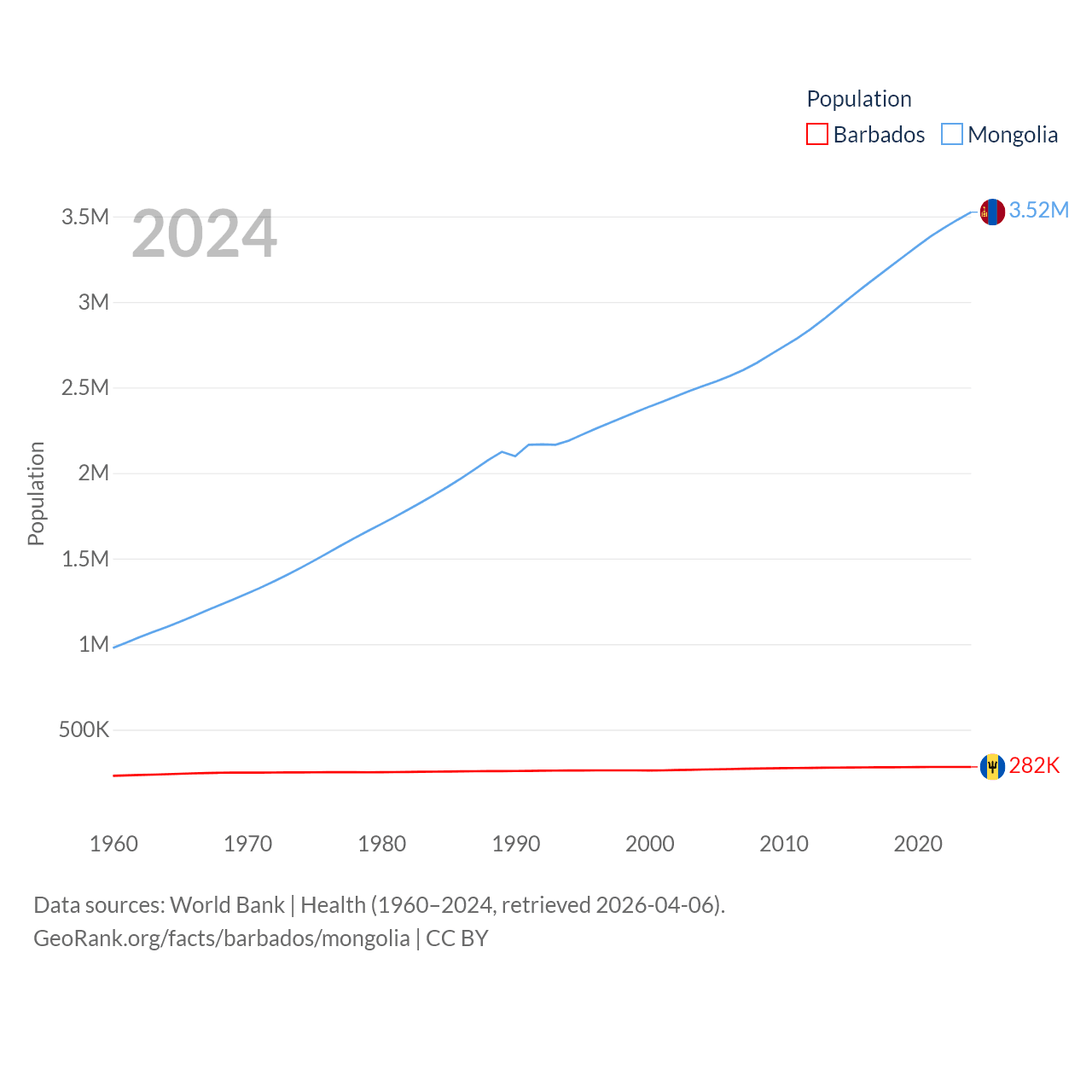 Barbados has a population of 282K (ranked 175/197), compared with 3.52M in Mongolia (ranked 132/197). Barbados' land area is 166 sq mi versus 601,740 sq mi for Mongolia (ranked 184th vs. 18th).