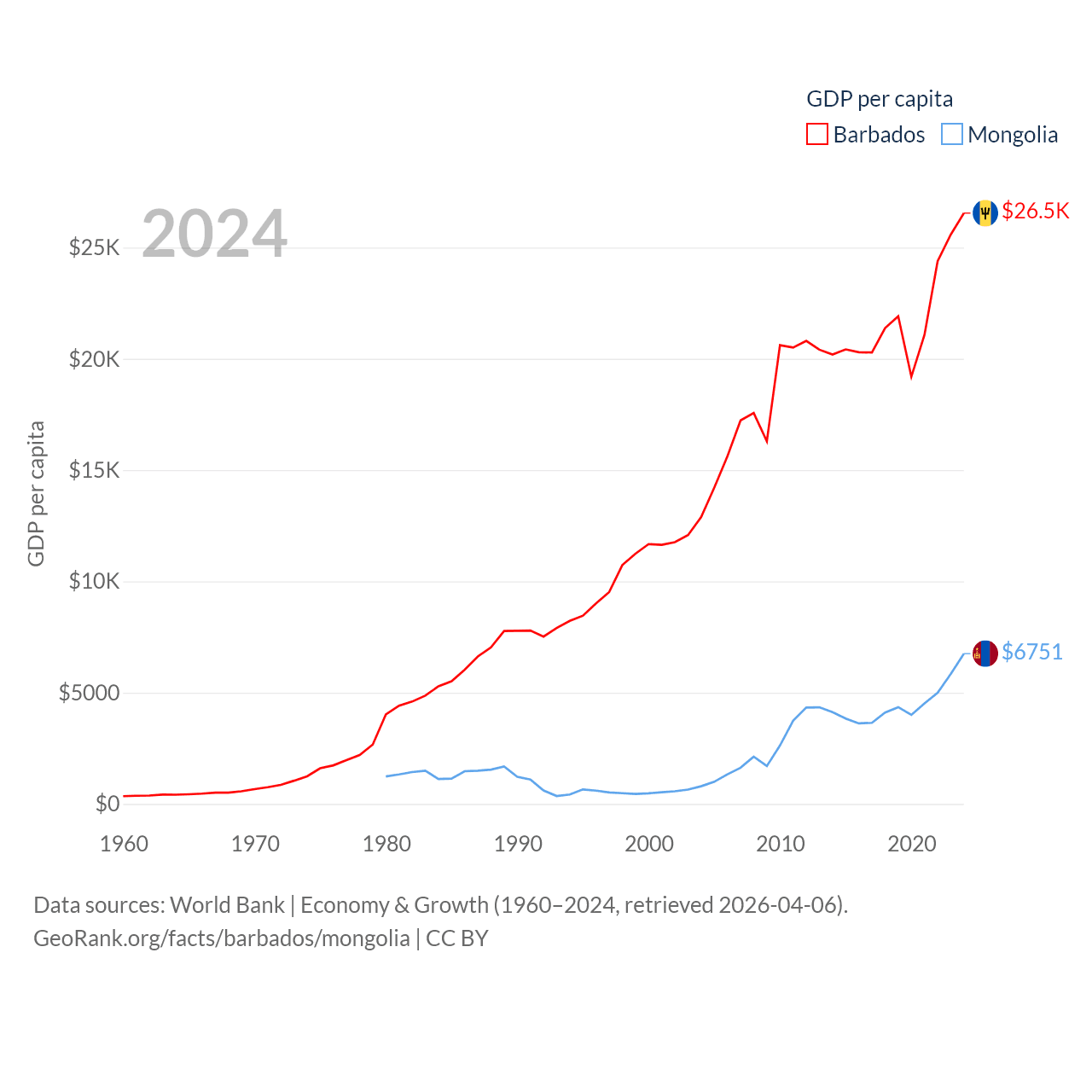 By GDP, Barbados ranks 157/197 ($7.5B) and Mongolia ranks 121/197 ($23.8B). By GDP per capita, Barbados ranks 46/197 ($26,545), while Mongolia ranks 105/197 ($6,751).