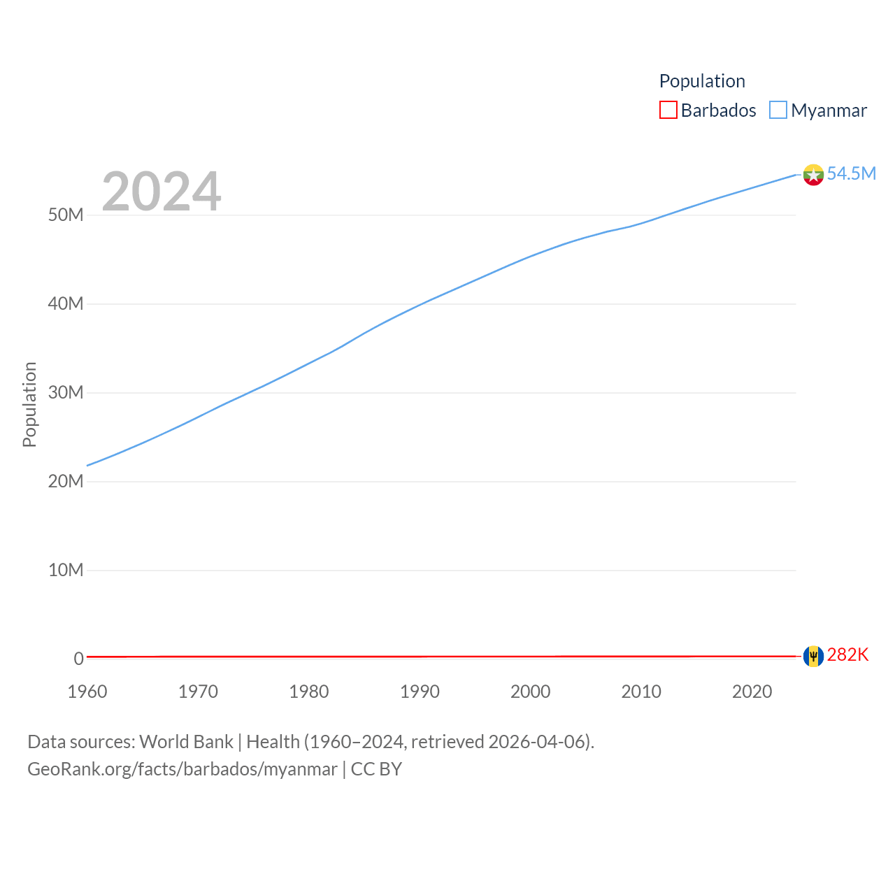 Barbados has a population of 282K (ranked 175/197), compared with 54.5M in Myanmar (ranked 27/197). Barbados' land area is 166 sq mi versus 251,997 sq mi for Myanmar (ranked 184th vs. 39th).
