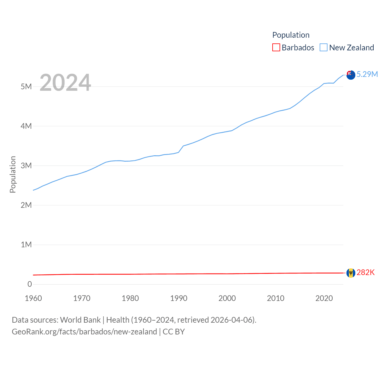 Barbados has a population of 282K (ranked 175/197), compared with 5.29M in New Zealand (ranked 123/197). Barbados' land area is 166 sq mi versus 101,665 sq mi for New Zealand (ranked 184th vs. 74th).