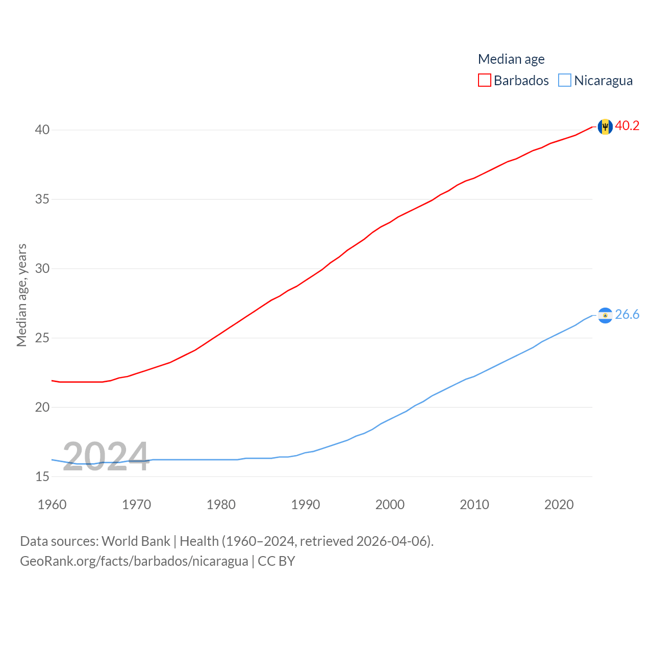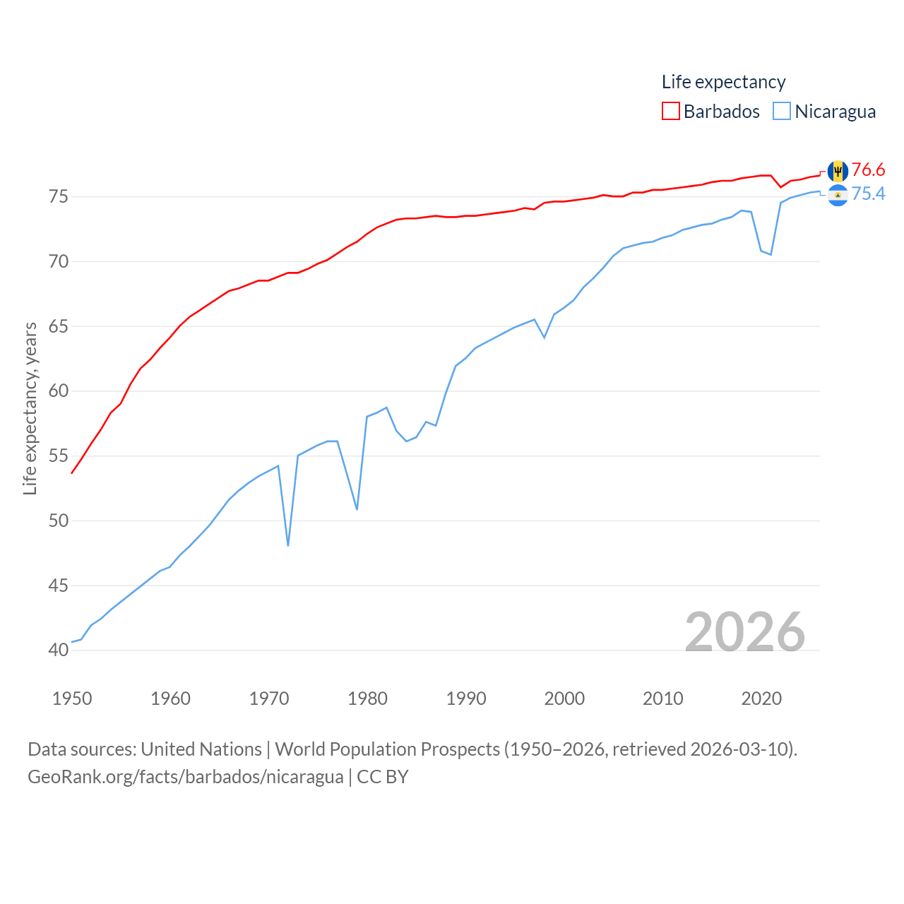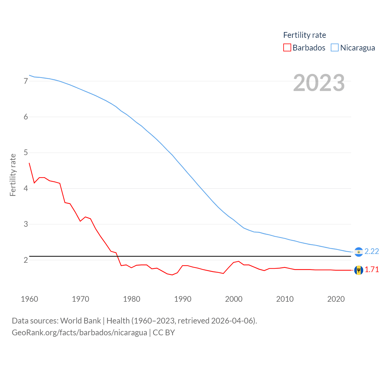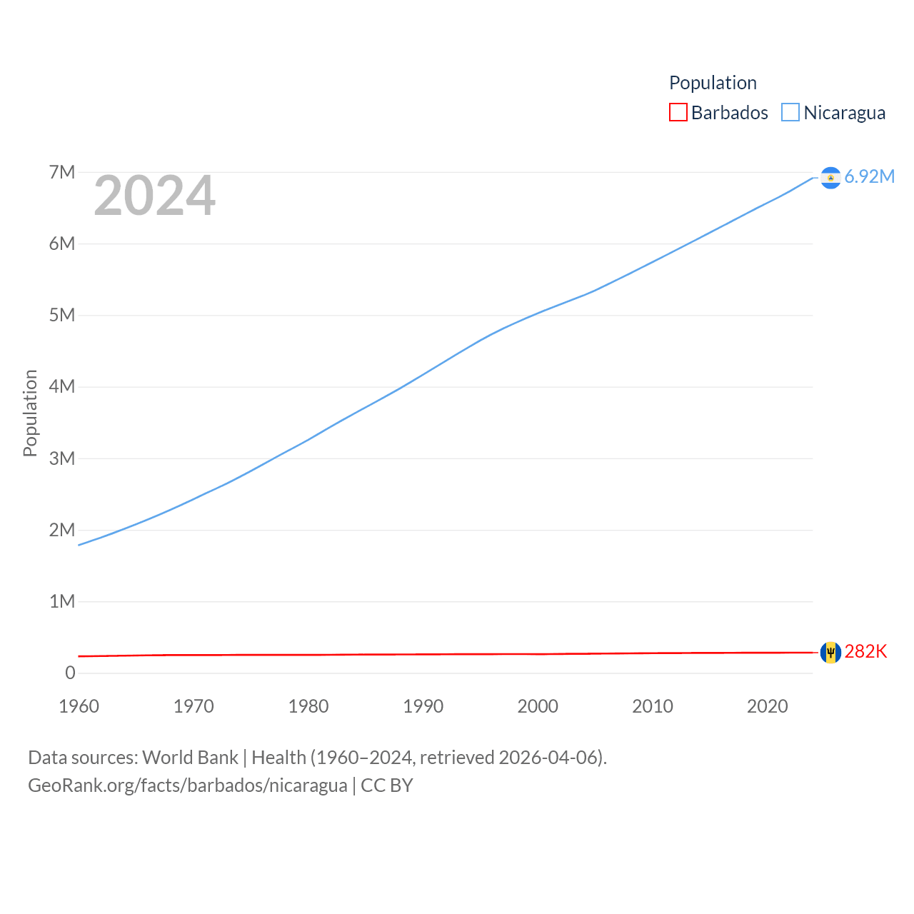 Barbados has a population of 282K (ranked 175/197), compared with 6.92M in Nicaragua (ranked 108/197). Barbados' land area is 166 sq mi versus 46,464 sq mi for Nicaragua (ranked 184th vs. 98th).