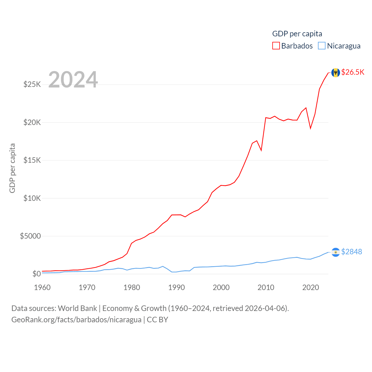 By GDP, Barbados ranks 157/197 ($7.5B) and Nicaragua ranks 131/197 ($19.7B). By GDP per capita, Barbados ranks 46/197 ($26,545), while Nicaragua ranks 141/197 ($2,848).