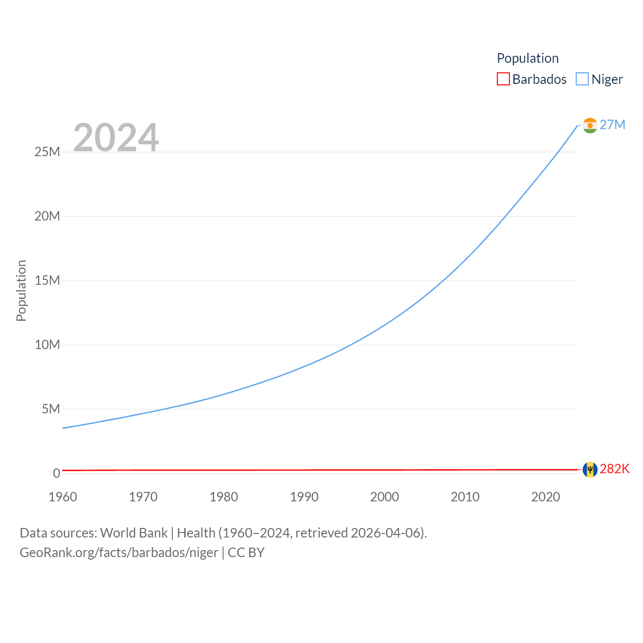 Barbados has a population of 282K (ranked 175/197), compared with 27M in Niger (ranked 55/197). Barbados' land area is 166 sq mi versus 489,076 sq mi for Niger (ranked 184th vs. 20th).