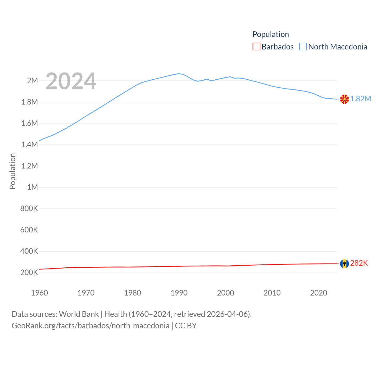 Barbados has a population of 282K (ranked 175/197), compared with 1.82M in North Macedonia (ranked 150/197). Barbados' land area is 166 sq mi versus 9,737 sq mi for North Macedonia (ranked 184th vs. 145th).