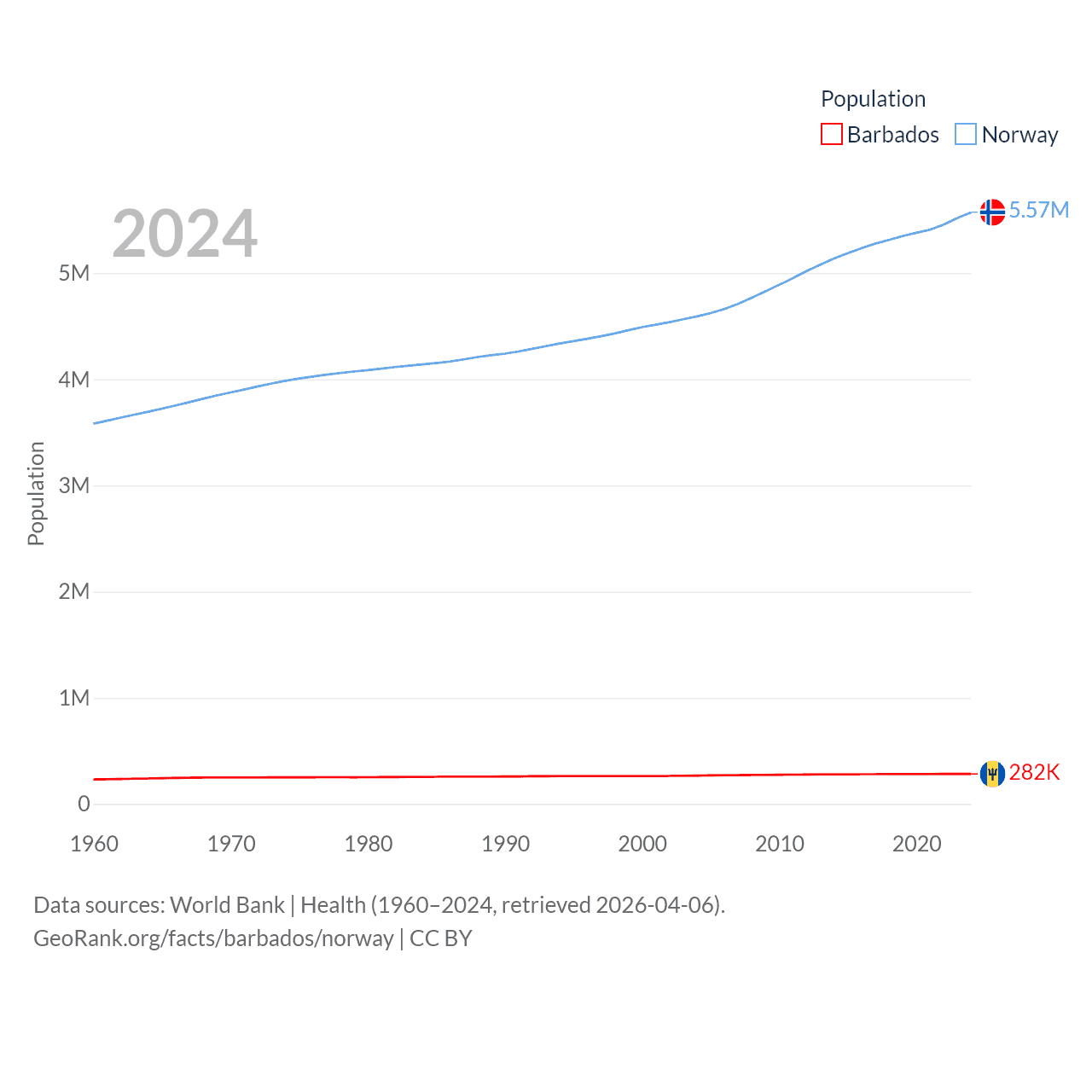 Barbados has a population of 282K (ranked 175/197), compared with 5.57M in Norway (ranked 118/197). Barbados' land area is 166 sq mi versus 140,645 sq mi for Norway (ranked 184th vs. 62nd).
