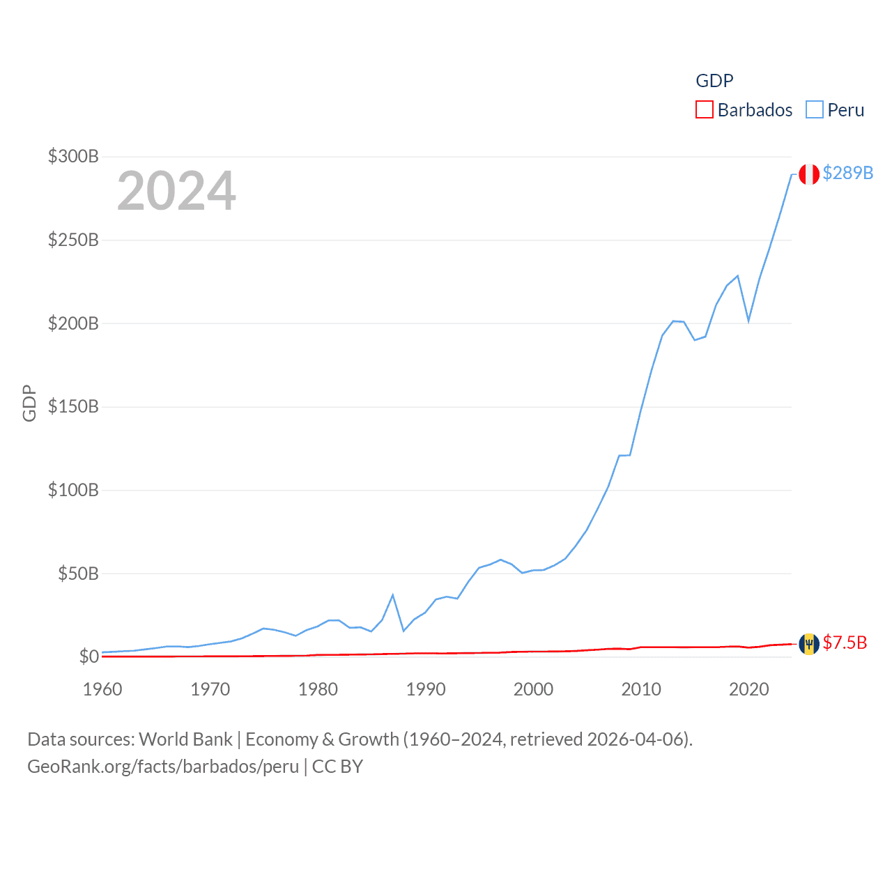 By GDP, Barbados ranks 157/197 ($7.5B) and Peru ranks 49/197 ($289B). By GDP per capita, Barbados ranks 46/197 ($26,545), while Peru ranks 91/197 ($8,452).