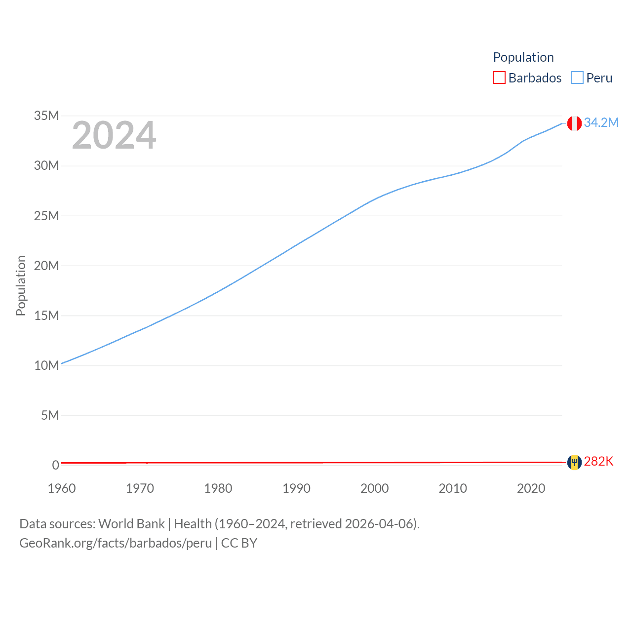 Barbados has a population of 282K (ranked 175/197), compared with 34.2M in Peru (ranked 48/197). Barbados' land area is 166 sq mi versus 494,211 sq mi for Peru (ranked 184th vs. 19th).