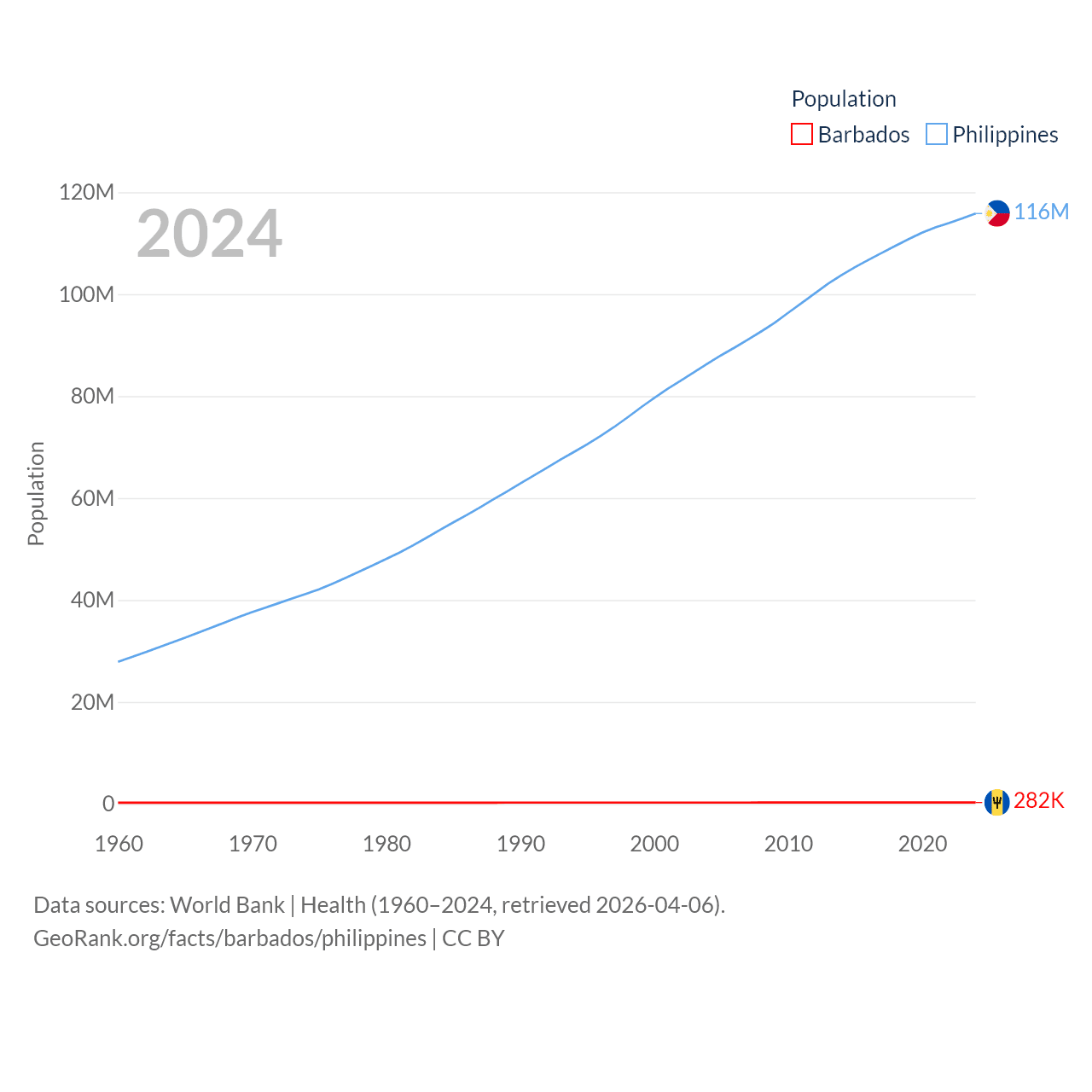 Barbados has a population of 282K (ranked 175/197), compared with 116M in The Philippines (ranked 14/197). Barbados' land area is 166 sq mi versus 115,124 sq mi for The Philippines (ranked 184th vs. 71st).