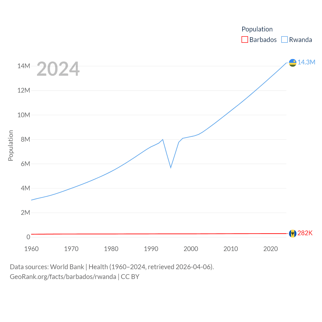 Barbados has a population of 282K (ranked 175/197), compared with 14.3M in Rwanda (ranked 77/197). Barbados' land area is 166 sq mi versus 9,525 sq mi for Rwanda (ranked 184th vs. 146th).